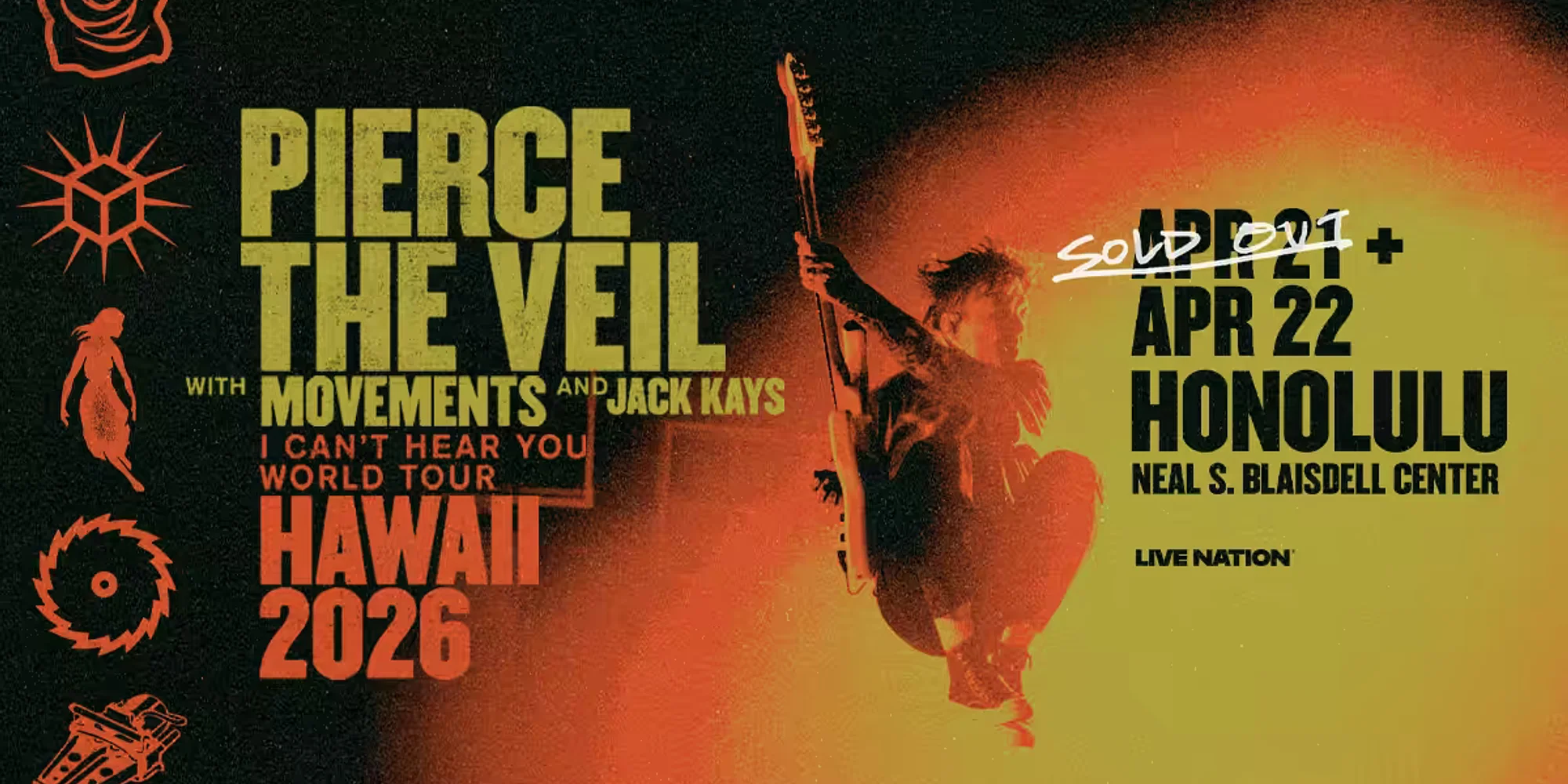 Pierce The Veil – I Can’t Hear You World Tour (EHB0421/EHB0422) Tuesday, April 21 TICKETS Wednesday, April 22 TICKETS Tuesday, April 21, 2026 @ 7:00 pm / Doors @ 6:00 pm Wednesday, April 22, 2026 @ 7:00 pm / Doors @ 6:00 pm Valet Parking EHB0421P / EHB0422P Ages 4 & up will need to purchase a ticket for entry. Ticket limit of 6 per household to be in effect for the entire time of ticket sales. This event provides for ASL seating. Venue: Blaisdell Arena Sale Date: Public on sale: Friday, Oct 24, 2025 @ 10:00 am HST Ticket Value: (Include appropriate S/C)Use ADULT: $100 GA Floor / Riser N / P / S/ T / D/ E / F/ G $130 Loges $100 Upper Level rows C-F $80 Upper Level middle rows $60 Upper Level top rows Payment Accepted by: Cash/Visa/Master Card/Discover Service Fees: Box Office sales – $1.00 per ticket facility fee Applicable fees apply to all Ticketmaster Internet/Mobile. Ticketmaster: Online www.ticketmaster.com Ticketmaster TDD (Telecommunications Device for the Deaf): 1-800-474-4833 Blaisdell Box Office: Blaisdell Box Office info line: (808) 768-5252 Blaisdell Box Office TDD (Telecommunications Device for the Deaf): (808) 768-9270