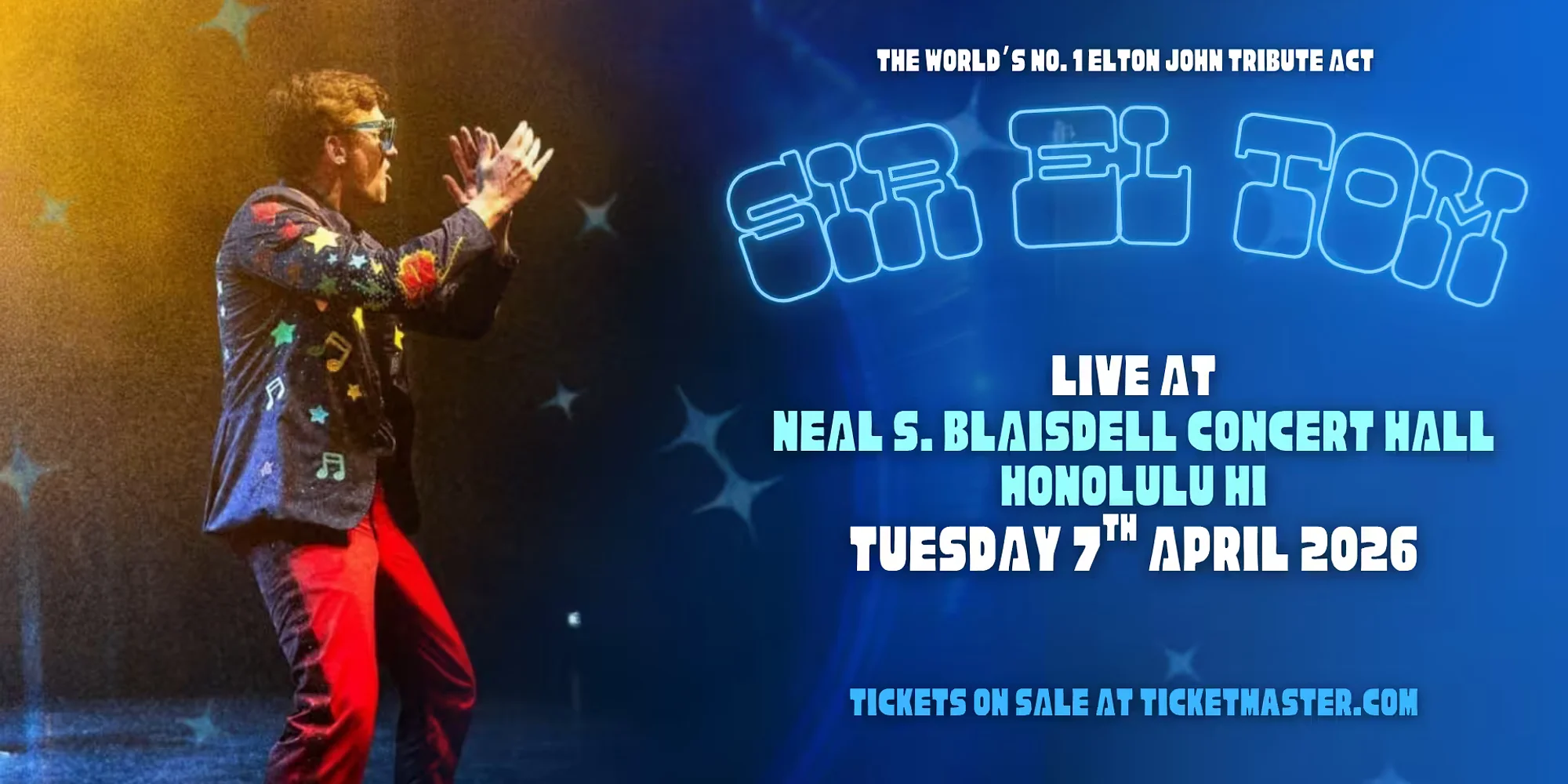 Sir El Tom (EHC0407) TICKETS Tuesday, April 7, 2026 @ 7:00pm HST Valet Parking EHC0407P Ages 4 and up will need to purchase a ticket for entry. Ticket limit of 8. This event provides for ASL seating. Venue: Blaisdell Concert Hall Sale Date: Tuesday, December 23, 2025 @ 10:00 am HST Ticket Value: (Include appropriate S/C)Use ADULT: $70 Orch AA – G $60 Orch H – Q / Balc A – H $50 Orch R – Z $40 Balc J – N $30 Balc O – S Payment Accepted by: Cash/Visa/Master Card/Discover Service Fees: Box Office sales – $1.00 per ticket facility fee Applicable fees apply to all Ticketmaster Internet/Mobile. Ticketmaster: Online www.ticketmaster.com Ticketmaster TDD (Telecommunications Device for the Deaf): 1-800-474-4833 Blaisdell Box Office: Blaisdell Box Office info line: (808) 768-5252 Blaisdell Box Office TDD (Telecommunications Device for the Deaf): (808) 768-9270 The world’s #1 Elton John tribute is coming to Honolulu for one night only. Tom Cridland began performing Elton’s music to recover from alcoholism, and has become a singer, songwriter, producer & pianist aka “Sir El Tom”. Tom learnt the piano almost overnight during the Covid-19 lockdowns as part of his recovery but in a couple of years he went from playing pubs to headlining theatres, amphitheatres and arenas. He plays all of Elton John’s best loved classic hits, album tracks, deep cuts and fan favourites, including Rocket Man, Saturday Night’s Alright (For Fighting), The Bitch Is Back, Don’t Let The Sun Go Down On Me, Crocodile Rock, I’m Still Standing, Bennie and the Jets, Your Song, Candle In The Wind, Tiny Dancer, Goodbye Yellow Brick Road, Funeral For A Friend/Love Lies Bleeding and many more. Away from the stage Tom is a songwriter and producer who has worked in the recording studio with a long list of musical legends including The Stylistics, Shania Twain, Ronnie Wood, Steve Lukather as well as Nigel Olsson, Davey Johnstone and Sir Elton John himself.