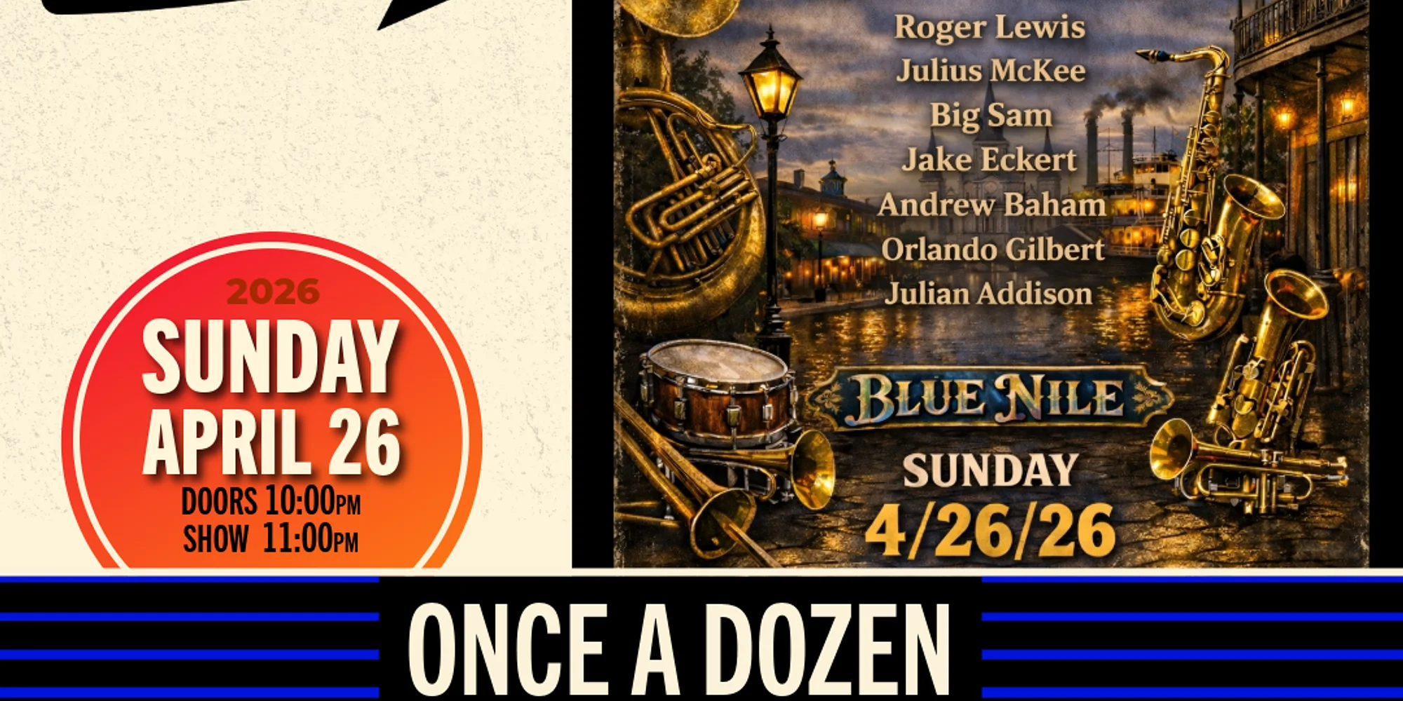 19th Annual Backbeat JazzFest Series presents Once A Dozen Featuring Past & Current Members of the Grammy Award Winning Dirty Dozen Brass Band: Roger Lewis, Julius McKee, Big Sam, Jake Eckert, Andrew Baham, Orlando Gilbert, Julian Addison Sunday April 26 Doors 10:00PM / Show 11:00PM Advance Tickets $20 + Processing Fees & Applicable Taxes at Checkout. Day of show $25 + Processing Fees & Applicable Taxes at Checkout. All sales are final and refunds are only allowed in limited circumstances such as canceled events. If your event is canceled, postponed, rescheduled, or moved, we will attempt to contact you to update you on the status of the event, and inform you of any refund, credit, or exchange procedures. All shows are for ages 21 and up. Valid ID required upon entry. ADVANCE TICKETS