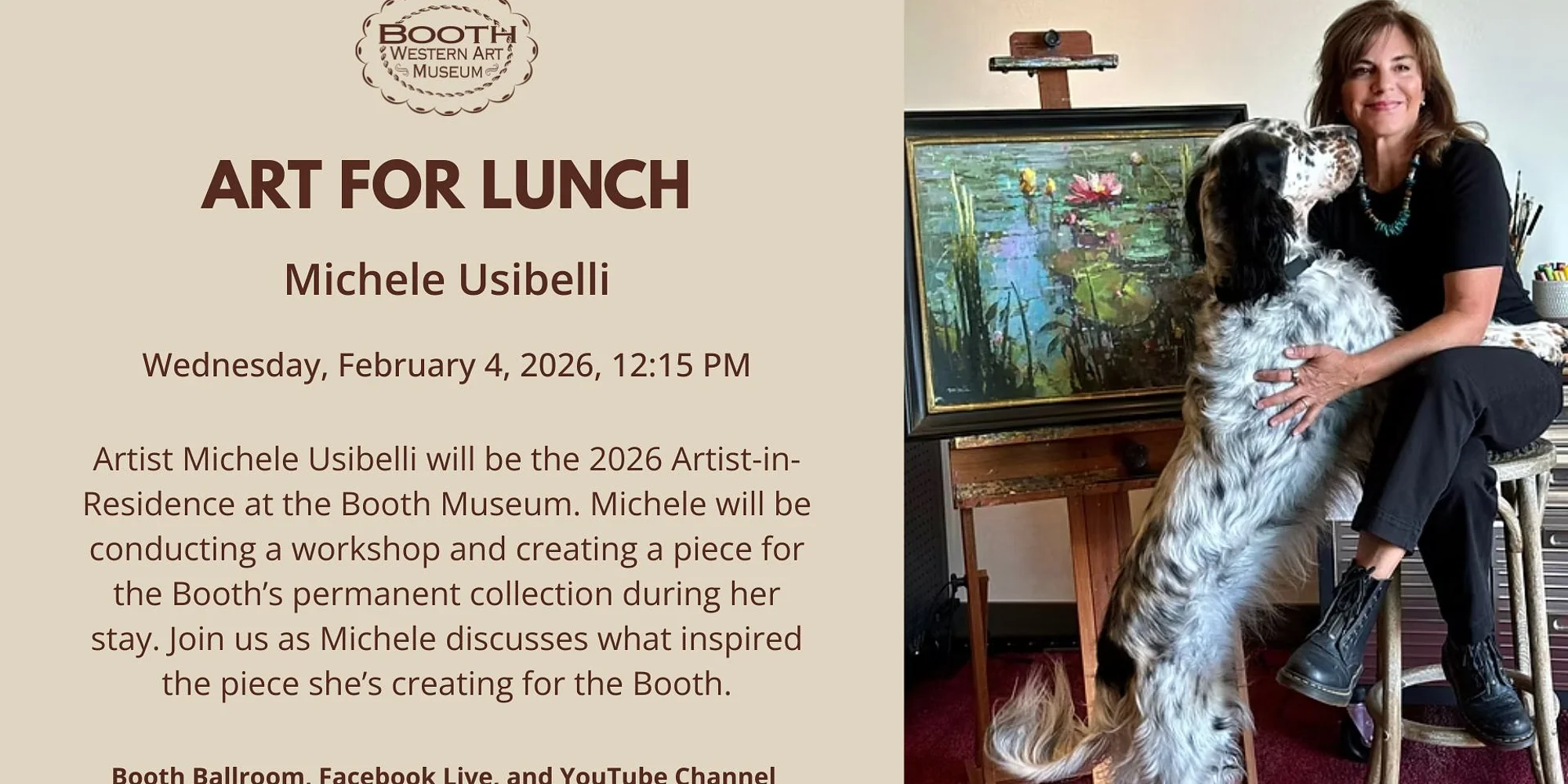 Art For Lunch: Michele Usibelli Wednesday, February 4, 2026 12:15 PM in the Miller/Rhoden Ballroom Artist Michele Usibelli will be the 2026 Artist-in-Residence at the Booth Museum. Michele will be conducting a workshop and creating a piece for the Booth’s permanent collection during her stay. Join us as Michele discusses what inspired the piece she’s creating for the Booth. Lunch will be available for $15.00 plus tax. Deadline to register for lunch is Noon, February 3. Go to boothmuseum.org to make your reservation for lunch or watch LIVE on Booth Museum’s Facebook page and YouTube channel. Attendees are encouraged to arrive early. Program included with admission. No outside food or beverages. Register HERE.