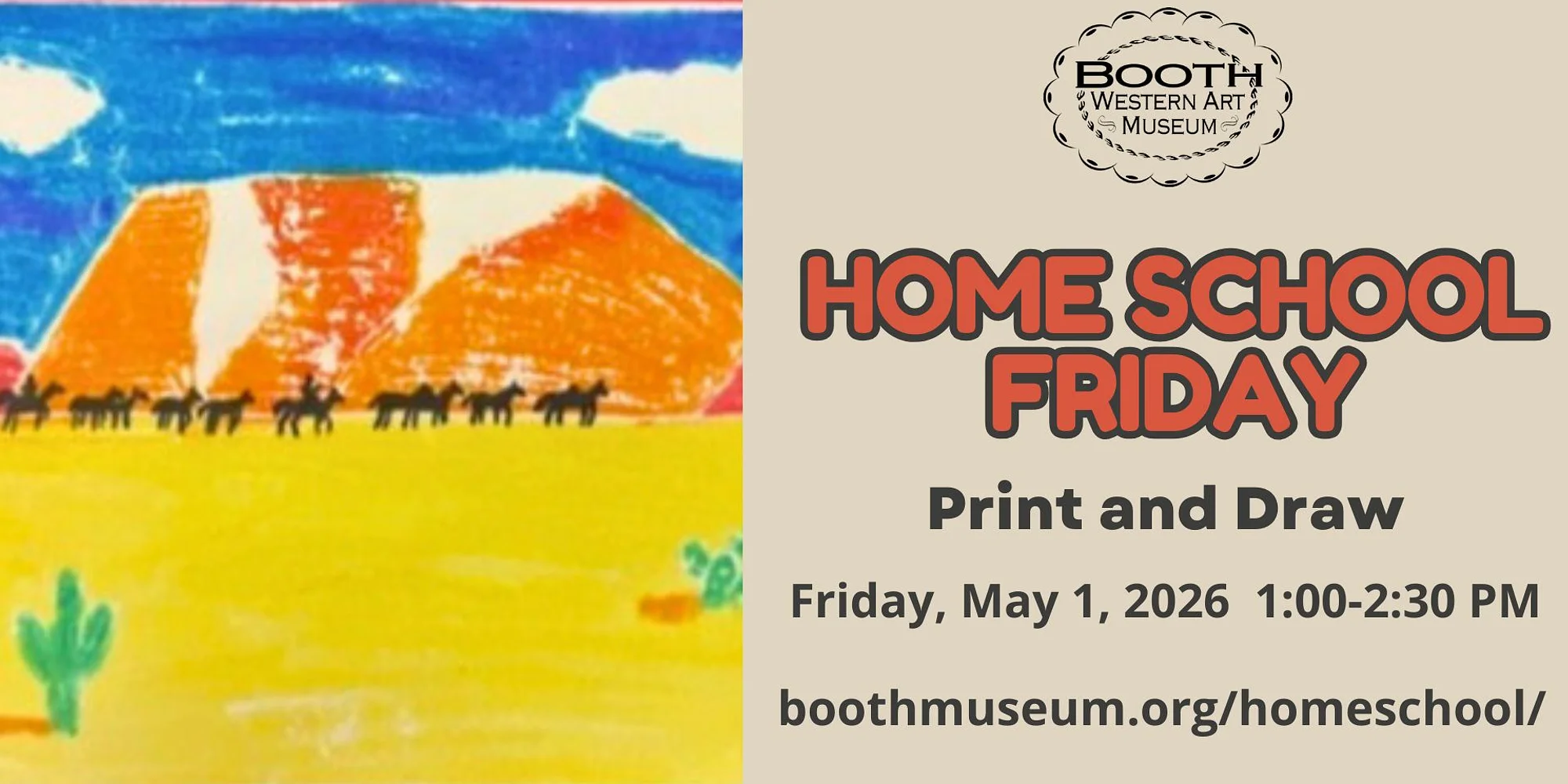 Home School Friday: Print and Draw Friday, May 1, 2026 1:00-2:30 PM Learn about scale and proportion by viewing Maynard Dixon’s, Red Butte with Mountain Men. Participants will use a marker transfer technique to create a landscape of their choice then draw in figures on top. This will allow them to test their knowledge on scale and proportion in a fun way. Pick-up / Drop-off: Borderlands Classroom REGISTRATION DEADLINE: Friday, April 24, 2026 Cost $10 for Museum Members / $12 for Non –members Ages 7-12 All classes include a tour of related artwork. Location: Booth Western Art Museum / Drop-off and Pick-up: Borderlands Classroom For more information call 770-387-1300 ext. 7271 REGISTER HERE