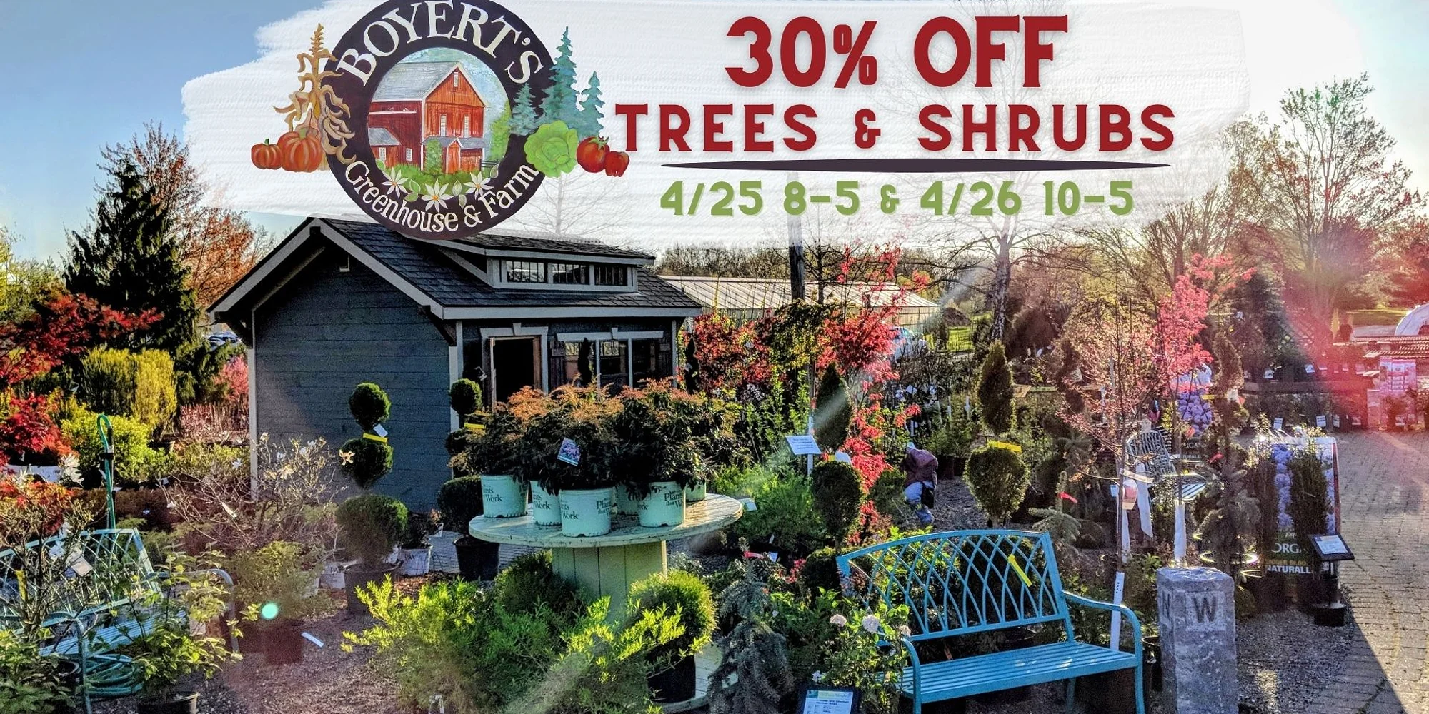 @ Our annual Tree & Shrub Sale is back! 30% off ALL trees and shrubs in our nursery Saturday, 4/25 from 8am-5pm and Sunday 4/26 from 10am-5pm. As always, first come, first serve! We do not honor rain checks. Our nursery is PACKED with beautiful trees and shrubs. Feel free to come in early to make your “wish list” to alleviate some stress on the day of. Happy shopping! Add to calendar Google Calendar iCalendar Outlook 365 Outlook Live Details Date: Time: