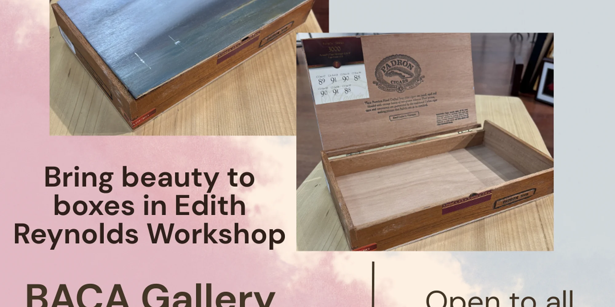 Join Gallery artist Edith Reynolds for this workshop to learn the best techniques for creating beautiful treasure boxes from simple cigar boxes. Materials included. Cost: $104 To register for this event, you can use this online form or please contact the Gallery at 203-433-4071 or baca06405@gmail.com