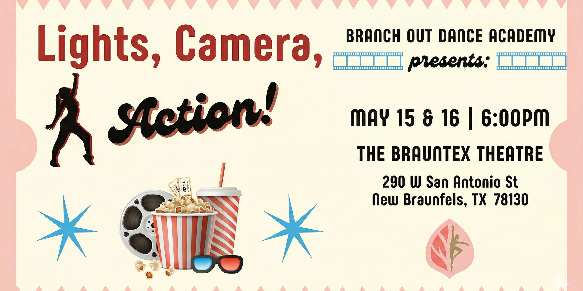 Branch Out Dance Academy’s 6th annual dance recital, “Lights, Camera, Action!” will showcase children and teens dancing ballet, jazz, tap, acro-dance, hip-hop, and more. Our students have worked very hard all year and we are excited to present a great show! Lights, Camera, Action! is presented by Branch Out Dance. This event is part of our rental program mission and is not produced by the Brauntex Performing Arts Theatre. We are pleased to provide our venue as the host location for their production.