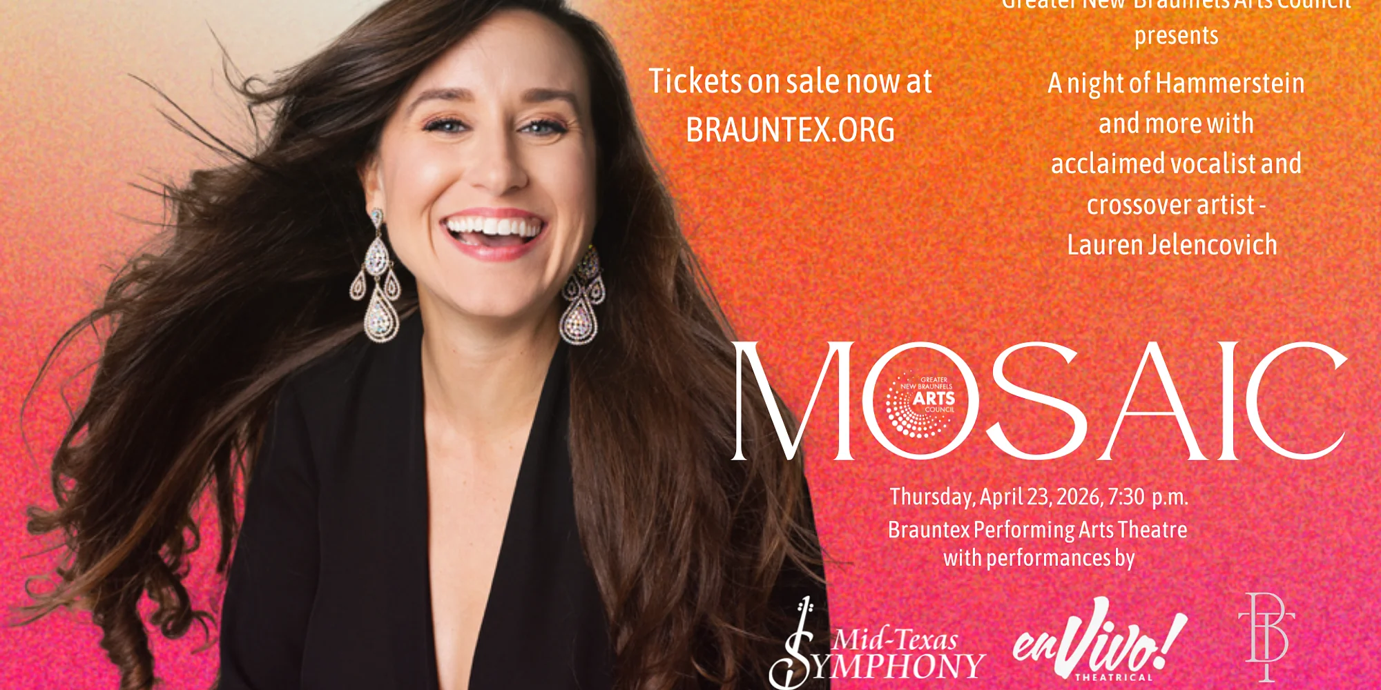 Greater New Braunfels Arts Council presents MOSAIC – a night of Hammerstein and more with acclaimed vocalist and crossover artist Lauren Jelencovich, featuring performances by Ballet Texas, En Vivo Theatrical, and the Mid-Texas Symphony. Lauren Jelencovich has garnered great acclaim for her affecting and sparkling portrayals of opera and musical theater roles throughout the United States and abroad. Lauren is currently on a World Tour with Yanni as his featured vocalist, and recently returned from Egypt, India, South America, China, Thailand, Russia, and Dubai, among other countries. A deeply passionate artist, Lauren is equally at home in Broadway, pop, and classical music. This event is part of our rental program mission and is not produced by the Brauntex Performing Arts Theatre. We are pleased to host their production at our venue.