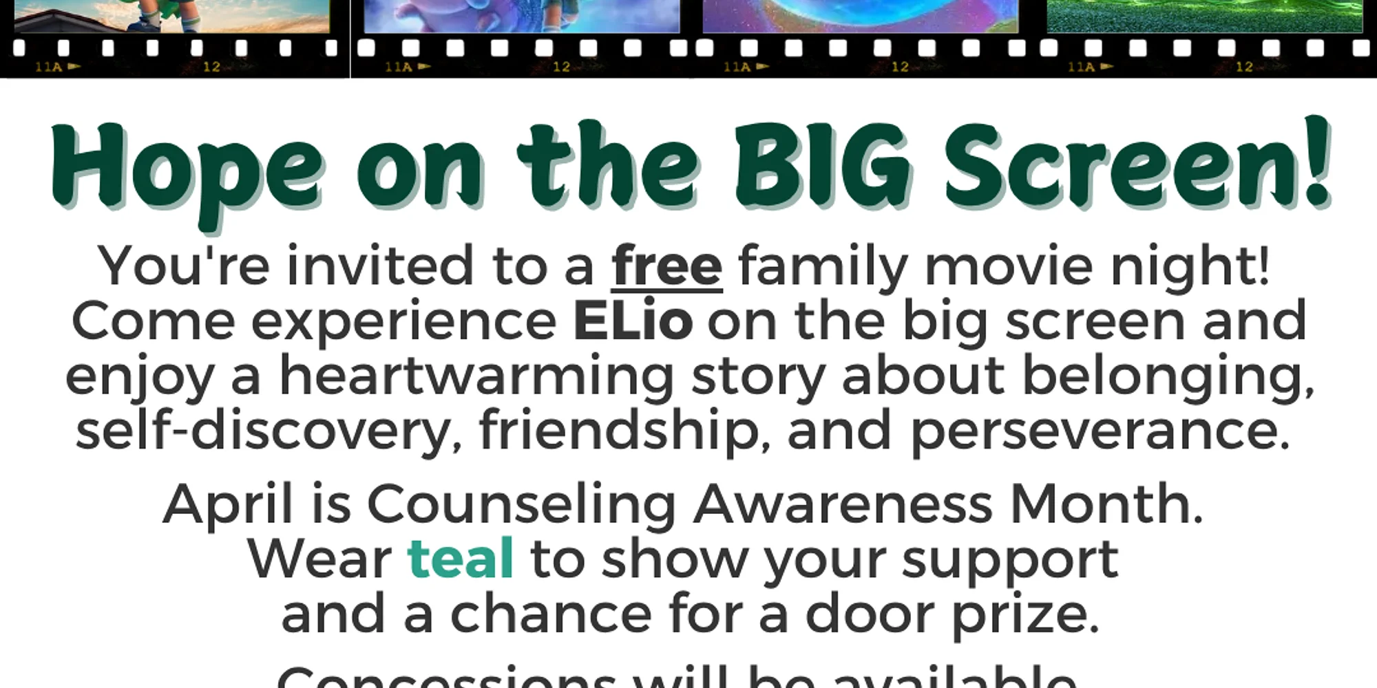 You’re invited to a free family movie night! Come experience ELio on the big screen and enjoy a heartwarming story about belonging, self-discovery, friendship, and perseverance. April is Counseling Awareness Month. Wear teal to show your support and a chance for a door prize. Concessions will be available. Admission is FREE! Reserve your seats today!