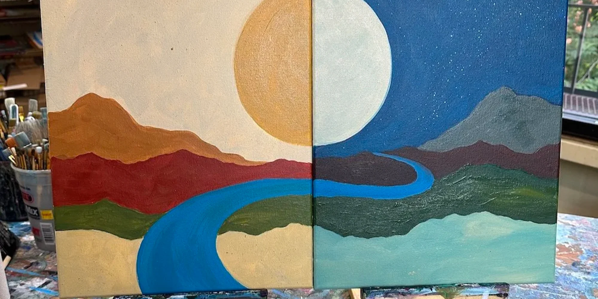 Night and Day: Unifying a Color Palette. Step by Step Class $65 Register Here Paint a Night and Day landscape in this step by step class that simplifies the basics of making a cohesive color palette by adding a single tone throughout, and we'll talk about how to use valve and texture to create a dynamic diptych that works as a set or two stand alone paintings. You’ll receive instruction on how to recreate the featured painting with tips on how to make it your own. - All materials included. We’ll be working on two 11” x 14” canvases using acrylic paints. - Please wear clothes you don’t mind getting paint on or bring an apron. - Feel free to bring any drinks or snacks - If you have any questions please email hello@breezeandbranch.com *Cancellations made within 72 hours of the event are not subject to a credit, refund or exchange. * Adults must accompany minors * Regisiter Here