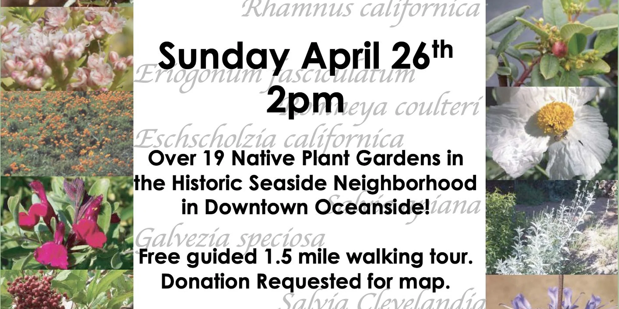 Over 19 Native Plant Gardens in the Historic Seaside Neighborhood in Downtown Oceanside! Free guided 1.5 mile walking tour. Donation Requested for map. Meet at St. Mary’s School, 515 Wisconsin Avenue, (one block east of the 101 Café, Coast Highway and Wisconsin St) Buena Vista Audubon Society BVAudubon.org Oceanside Coastal Neighborhood Association OCNA101.org