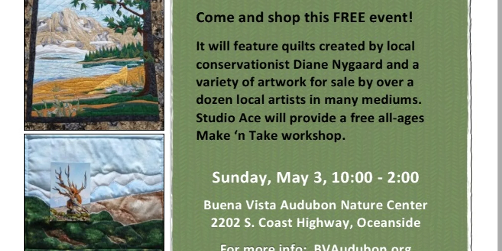 Come and shop this FREE event at the BVAS Nature Center! It will feature quilts created by local conservationist Diane Nygaard and a variety of artwork for sale by over a dozen local artists in many mediums. Studio Ace will provide a free all-ages Make ‘n Take workshop. Sunday, May 3, 10:00 – 2:00