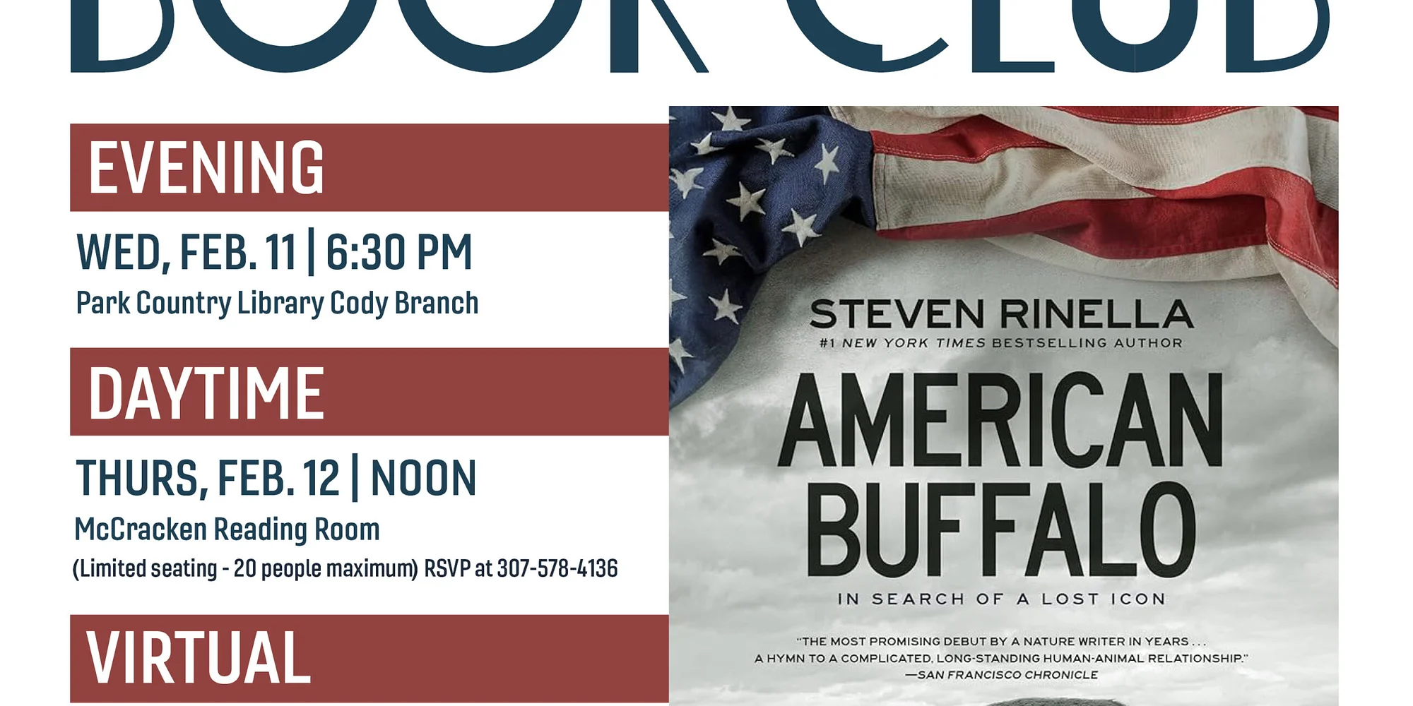 McCracken Research Library Book Club 2026 Buffalo Bill Center of the West In celebration of the Center of the West’s Buffalo Nation: America at 250, the McCracken Research Library invites readers to explore the powerful history, ecology, and cultural legacy of the American bison through a thoughtfully curated four-book series. Participants may join either in person or virtually, making this book club accessible to readers everywhere. The series opens with American Buffalo: In Search of a Lost Icon by Steven Rinella—part hunting narrative, part cultural history—examining the bison’s profound influence on the American landscape and national identity. A winner of the Sigurd Olson Nature Writing Award, the book blends personal storytelling with deep historical insight. As a special highlight, author Steven Rinella will speak at Cody Culture Club on February 12. Book club members are strongly encouraged to attend. This is a separate event. Purchase tickets from Cody Culture Club. Join us for engaging discussion, meaningful scholarship, and a deeper understanding of one of America’s most enduring icons. Evening Group: Location: Park Country Library Cody Branch. No registration required. Date: February 11, 2026, 6:30 PM Daytime Group: Location: McCracken Research Library Reading Room at the Buffalo Bill Center of the West (due to limited space, maximum of 20 participants, RSVP to Nathan Bender at 307-578-4136) Date: February 12, 2026, 12:00 PM Virtual Group: Platform: Zoom webinar with breakout groups Time: February 19th, 4:00 PM Mountain Time Link: https://us06web.zoom.us/j/89350514622?pwd=8SC8WX2cpFVI9an9NraEuLRduFd202.1 Meeting ID: 893 5051 4622 Passcode: 411766 Book Availability Points West Market at the Buffalo Bill Center of the West will offer American Buffalo for purchase. In addition, the Park County Public Library will provide a limited number of copies of each selected title for checkout several weeks prior to each meeting. The McCracken Research Library maintains noncirculating copies of all book club selections, available for on-site reading in the McCracken Library Reading Room during regular museum hours. Audiobook editions of all titles are also offered across multiple platforms.