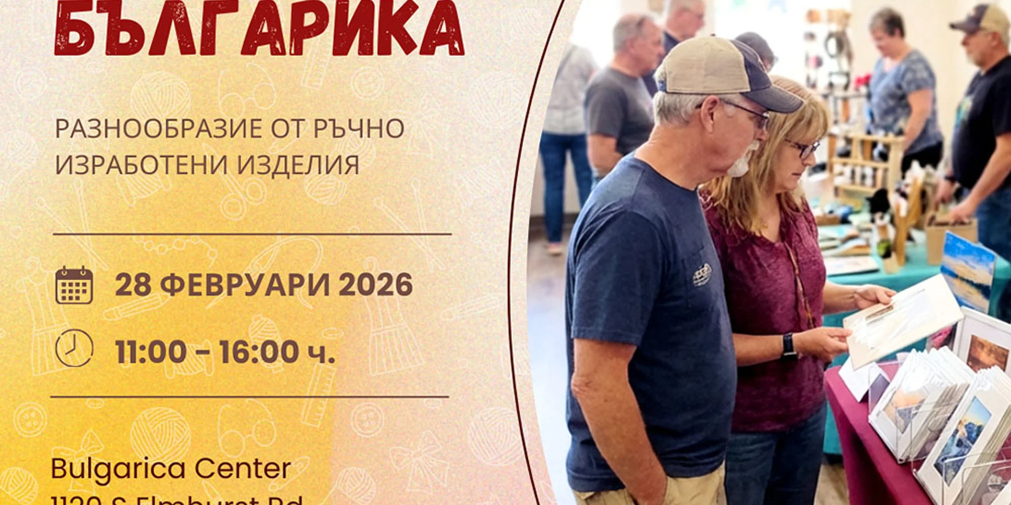 По традиция Българика ви кани на ежемесечния Базар на занаятите Българика – място за срещи, творчество и ръчно изкуство. Месечна среща с ръчното творчество Базарът ще се провежда всеки месец, като февруарското издание поставя началото на една нова, постоянна традиция, посветена на авторските изделия и малките творци. Кога: събота, 28 февруари 2026 г. | 11:00 – 16:00 ч. Къде: Bulgarica Center Адрес: 1120 S Elmhurst Rd, Mount Prospect, IL 60056 Авторски изделия с история и характер На базар на занаятите Българика ще откриете: – авторски бижута и аксесоари – ръчно изработени декорации и арт изделия – картини и художествени орнаменти – оригинални подаръци за деца и възрастни Всички изделия са създадени с много любов, внимание към детайла и често от естествени или рециклирани материали. Ще имате възможност да се срещнете с творците, да научите повече за техния процес и да изберете нещо наистина уникално – за себе си или за подарък. Очакваме ви на предстоящия базар на занаятите Българика – място за вдъхновение, творчество и срещи, което ще се случва всеки месец. Важно за нови вендори Ако вие сте вендор и желаете да участвате за ПЪРВИ ПЪТ в някое от бъдещите издания, посетете нашата страница Какво представлява Базар на занаятите Българика Галерия