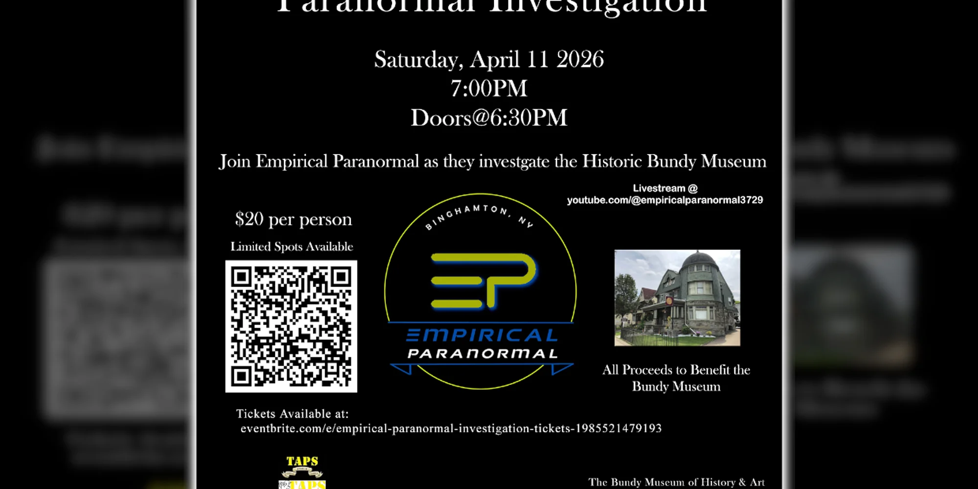 View fullsize The Bundy Museum and Empirical Paranormal Presents Empirical Paranormal Public Investigation of the Bundy Museum Hosted by: Empirical Paranormal (An Official TAPS Family Member) Please join Empirical Paranormal (An Official TAPS Family Member) to Help Save the Bundy Museum. All proceeds to benefit the Bundy Museum of History & Art. Empirical Paranormal continues to investigate this beautiful historical home/museum. When: Saturday, April 11th, 2026 Time: from 7:00 pm -11:00 pm Where: The Bundy Museum of History & Art Admission: $20 / person (* limit of 15 people / online RSVP only / see below) Reserve a spot for upcoming events!! To make an RSVP for this event, with full details, please click the button below. Empirical Paranormal Public Investigation of the Bundy Museum The Bundy Museum of History & Art 127-129 Main St. Binghamton, NY 13905 Ph: (607) 772-9179 Email: info@bundymuseum.org https://www.bundymuseum.org/ Donate and help support The Bundy Museum: https://www.bundymuseum.org/checkout/donate... Our Social Links: https://www.facebook.com/bundymuseum https://www.youtube.com/channel/UCbOwCAvnOSE0Ej3zt4RbEZw/featured https://twitter.com/BundyMuseum https://www.instagram.com/thebundymuseum/