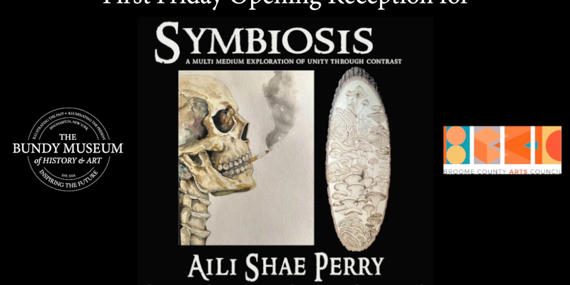 View fullsize The Bundy Museum Presents: First Friday Opening Reception for Symbiosis: A Multi Medium Exploration of Unity Through Contrast by Aili Shae Perry | Pyrography | Acrylic Paintings | Watercolors | Ink Drawings | First Friday Opening Reception April 3rd, 2026 6:00 pm – 9:00 pm Exhibition on display from 4.3.26 - 4.28.26 Located in the Bundy Museum 3rd floor art gallery Admission to the art gallery is always free Tuesday - Saturday 11:00 am - 5:00 pm No RSVP is required for the First Friday event For more information about this event and exhibit please contact us or visit the webpage. Contact Us Symbiosis: A Multi Medium Exploration of Unity Through Contrast by Aili Shae Perry The Bundy Museum of History & Art 127-129 Main St. Binghamton, NY 13905 Ph: (607) 772-9179 Email: info@bundymuseum.org https://www.bundymuseum.org/ Donate and help support The Bundy Museum: https://www.bundymuseum.org/checkout/donate... Our Social Links: https://www.facebook.com/bundymuseum https://www.youtube.com/channel/UCbOwCAvnOSE0Ej3zt4RbEZw/featured https://twitter.com/BundyMuseum https://www.instagram.com/thebundymuseum/ https://www.bundymuseum.org/wbdy WBDY-LP 99.5FM Online Radio http://www.radiorethink.com/tuner/?stationCode=wbdy&stream=hi