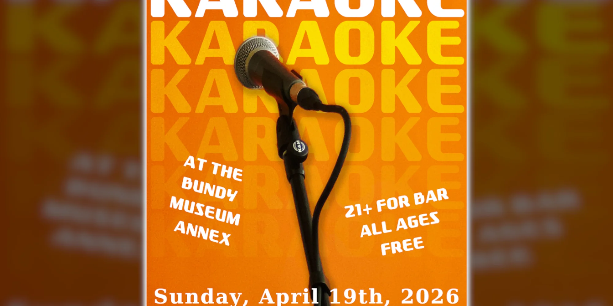 View fullsize The Bundy Museum Presents Karaoke Night Live at the Annex Theater Sunday, April 19th, 2026 Located at the Bundy Museum Annex Theater (behind the Bundy Museum) 129 Main St., Binghamton, NY Doors at 6:30 pm Karaoke starts at 7:00 pm Free admission All ages / 21+ ID to drink at the Bundy Annex Bar The Bundy Annex bar features food, coffee, beer and wine at our shows. Come on down and enjoy quality good food and an adult beverage. For more information about this event, feel free to contact us or visit the webpage. Contact Us Karaoke Night - Live at the Annex Theater The Bundy Museum of History & Art 127-129 Main St. Binghamton, NY 13905 Ph: (607) 772-9179 Email: info@bundymuseum.org https://www.bundymuseum.org/ Donate and help support The Bundy Museum: https://www.bundymuseum.org/checkout/donate... Our Social Links: https://www.facebook.com/bundymuseum https://www.youtube.com/channel/UCbOwCAvnOSE0Ej3zt4RbEZw/featured https://twitter.com/BundyMuseum https://www.instagram.com/thebundymuseum/ https://www.bundymuseum.org/wbdy WBDY-LP 99.5FM Online Radio http://www.radiorethink.com/tuner/?stationCode=wbdy&stream=hi