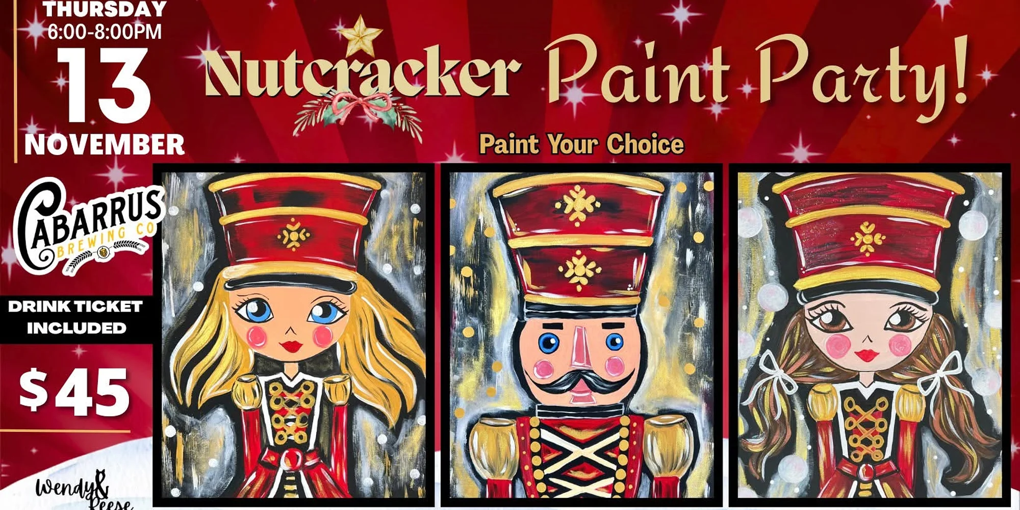 Tickets: https://addmi.com/e/-OWSGmFsmazlZMY9gwxm Join us for a creative night out at Cabarrus Brewing! Relax with friends, sip your favorite drink, and paint a festive nutcracker to add to your seasonal decor. You’ll paint this fun and easy nutcracker on a pre-drawn 12×16 canvas with step-by-step instruction—perfect for beginners and seasoned painters alike. Choose from 3 nutcracker designs: Mr. Nutcracker, Mrs. Nutcracker, or Nutcracker with Pigtails. Whether you’re coming with friends, enjoying a date night, or flying solo, it’s a great way to relax, sip, and paint something lovely. Your ticket includes: All painting supplies and instruction A drink ticket good for your choice of beer, cider, wine, or a non-alcoholic beverage Come early to grab a bite to eat and settle in—we’ll provide everything you need for a fun and colorful evening!