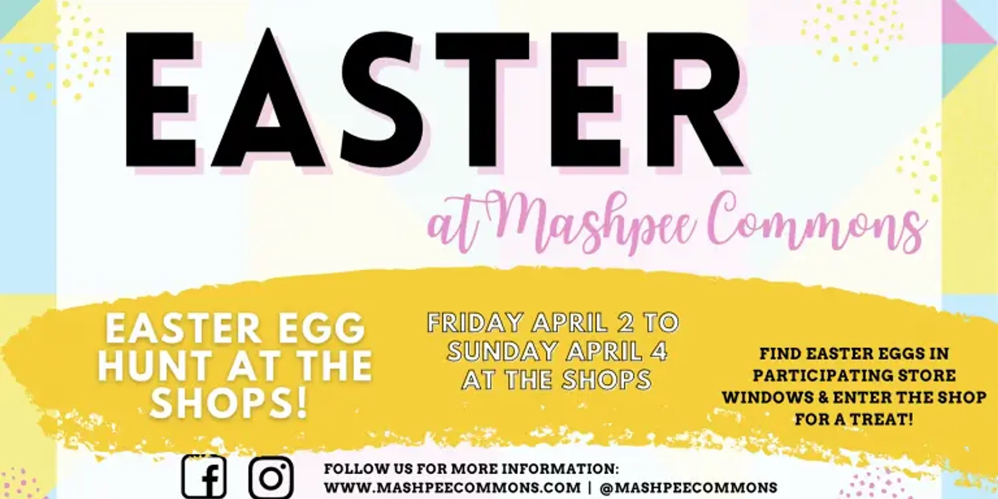 Meet the Easter Bunny & Egg Hunt at the Commons Join us for our free, family-friendly Easter festivities at Mashpee Commons on Saturday April 4th, 2026, beginning at 11:00AM! Free, family-friendly Easter festivities! Meet the Easter Bunny and Egg Hunt at participating shops. 🐰 MEET THE EASTER BUNNY (11:00AM – 2:00PM) Take a photo with the Easter Bunny in Central Square with our Easter-themed balloon backdrop! Complimentary Chocolate Eggs made by Ghelfi’s (while supplies last) 🎨 MUSIC ENTERTAINMENT WITH LEMONADIO (11:00AM – 2:00PM) In Central Square by the Easter Bunny 🥚 EGG HUNT AT THE SHOPS (All Day) Find Easter Egg Posters in participating store windows and enter the shop for a sweet treat, while quantities last. 🐾 EASTER EGG HUNT FOR PUPS PRESENTED BY HOT DIGGITY (11:00AM SHARP) Hot Diggity hosts the annual egg hunt for dogs. Furry friends are invited to take part in what has become the Cape’s biggest canine egg hunt. The fun starts on the Village Green across from the Mashpee Library at 11AM sharp and goes fast! Hosted by Hot Diggity, the hunt will include 4,000 plastic eggs filled with tasty treats for pups, along with dog toys and tennis balls. The Easter Bunny even takes account for dogs with sensitive tummies, color coding eggs to indicate certain ingredients. Humans are asked to kindly have their pups leashed and bring a basket for collecting eggs and some clean-up bags. The event is rain or shine.