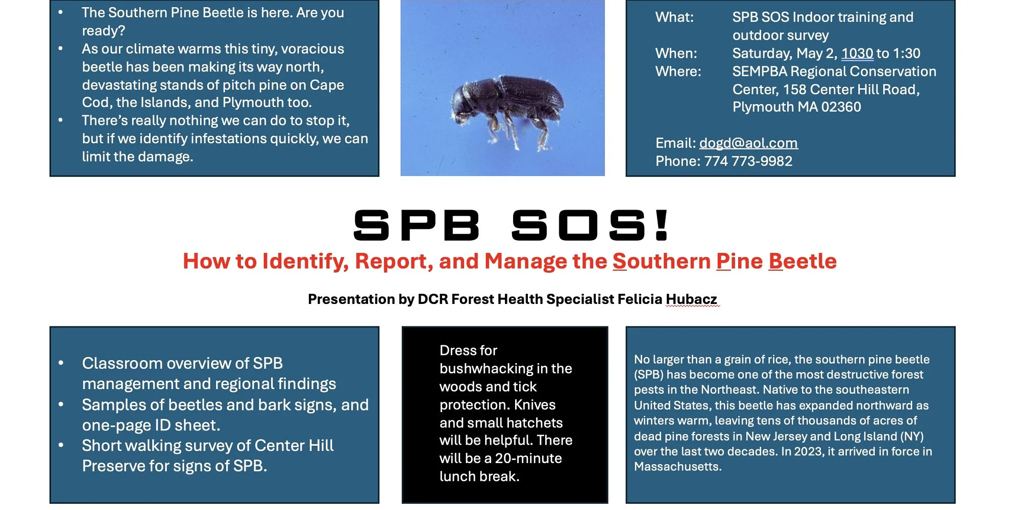 If you love the woods, personally or professionally, you should know how to identify and report the Southern Pine Beetle: a tiny, voractious beetle that has moved north and is now threatening stands of pitch pine – the signature tree of the Massachusetts Coastal Pine Barrens. At our May 2nd training, you’ll learn how to identify it, report it, and what is being done to manage it. DCR Forest Health Specialist Felicia Hubacz will lead indoor and outdoor portions of the training.