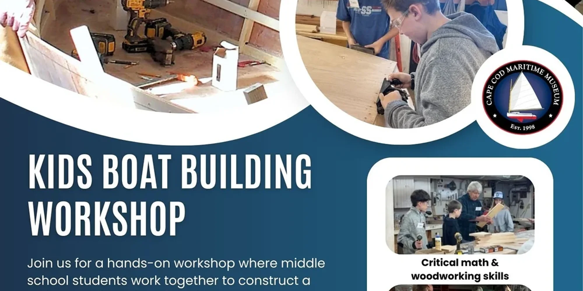 Youth Boat Building Workshop Saturdays, February 7 – Saturday, April 25, 2026 Join us for a hands-on workshop where middle school students work together to construct a 12-foot traditional rowing skiff from a standardized boat-building kit. Open to participants in grades 6–8 Saturdays | 9:30 AM – 12:30 PM Runs for 10–12 weeks Led by experienced and highly talented museum volunteers Over those 12 weeks, the students have the helm – building their boat under the guidance of our expert volunteers. They assemble the whole boat, design its colors, and pick its name, all before taking it out on the water for its first voyage, and rowing away with a wonderful sense of accomplishment. Since the Youth Boat Building program was launched in 2012, over thirty Bevin’s skiffs have been built. There is joy and wonder in hanging out in a Boat Shop within a Maritime Museum, where Cape Cod’s proud maritime heritage meets the curiosity and eagerness of young learners, gaining new skills. Email or call us for more information tirwin@capecodmaritimemuseum.org 508-815-4438
