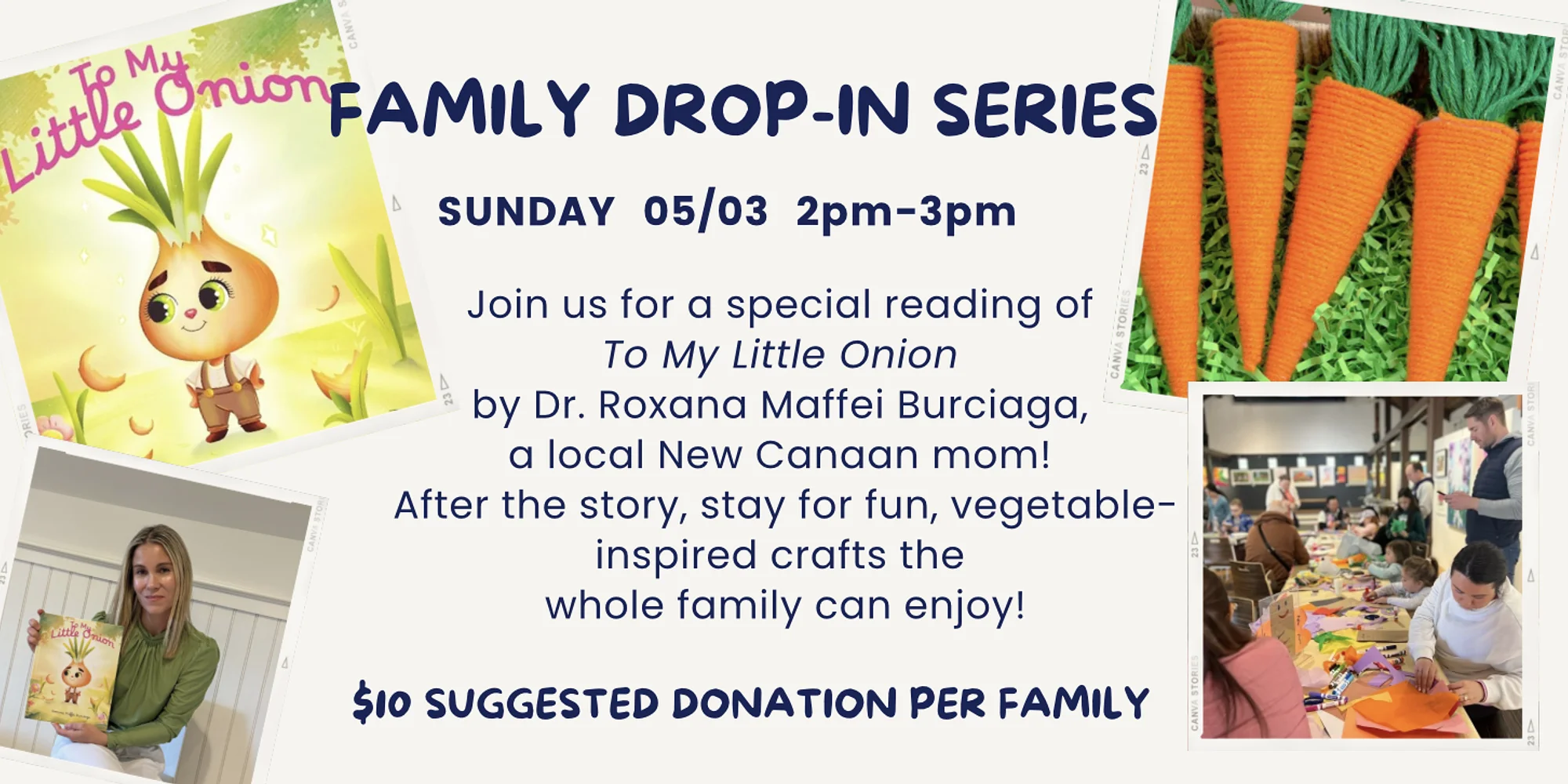 Join us for a free family drop-in filled with crafts, stories, and hands-on fun for all ages. Enjoy a special reading of To My Little Onion by the author herself, Dr. Roxana Maffei Burciago—fellow New Canaan mom—followed by a vegetable-inspired craft where children will create imaginative pieces to take home and enjoy. A joyful afternoon of imagination, creativity, and community—come make, explore, and have fun together. All are welcome! $10 Suggested Donation Family Drop-In: To My Little Onion (5/03) "*" indicates required fields Name* First Last Email* Address* Street Address Address Line 2 City AlabamaAlaskaAmerican SamoaArizonaArkansasCaliforniaColoradoConnecticutDelawareDistrict of ColumbiaFloridaGeorgiaGuamHawaiiIdahoIllinoisIndianaIowaKansasKentuckyLouisianaMaineMarylandMassachusettsMichiganMinnesotaMississippiMissouriMontanaNebraskaNevadaNew HampshireNew JerseyNew MexicoNew YorkNorth CarolinaNorth DakotaNorthern Mariana IslandsOhioOklahomaOregonPennsylvaniaPuerto RicoRhode IslandSouth CarolinaSouth DakotaTennesseeTexasUtahU.S. Virgin IslandsVermontVirginiaWashingtonWest VirginiaWisconsinWyomingArmed Forces AmericasArmed Forces EuropeArmed Forces Pacific State ZIP Code Number of children attendees:* Name of Guests (if applicable): Carriage Barn Membership* I am a current member I am not a member Donation Please consider making a donation to support the Carriage Barn Arts Center Payment Method Credit Card American Express MasterCard Visa Supported Credit Cards: American Express, MasterCard, Visa Card Number Expiration Date Security Code Cardholder Name Total (for donation only) Δ