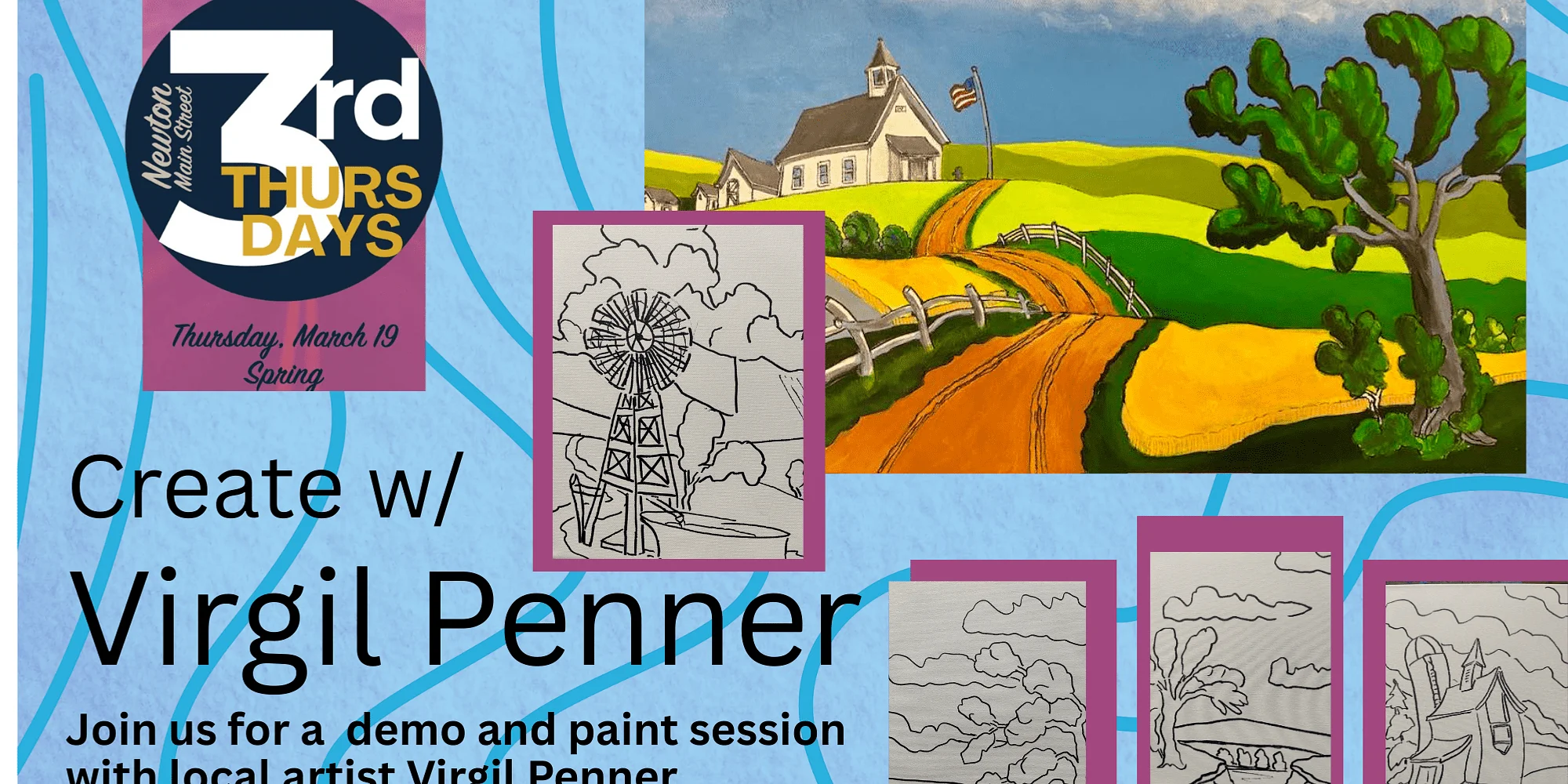 The gallery will host Paint with Penner, a demo and paint-along with member artist Virgil Penner, Third Thursday, March 19, 5:30-7:30. Space is limited, call the gallery to reserve your spot! 12×12 canvas all supplies provided. Free and open to the public, donations appreciated!