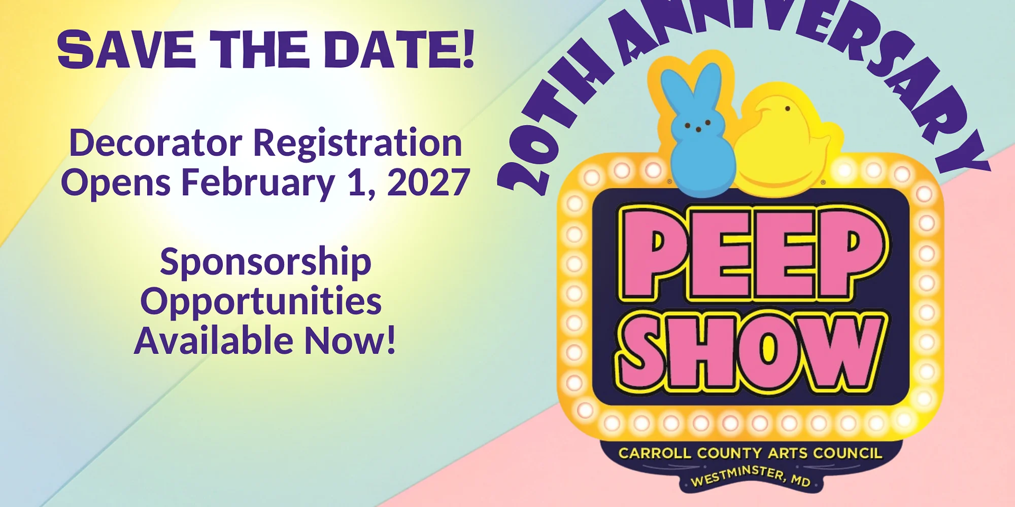 20th Anniversary PEEPshow! A Carroll County tradition, our beloved Spring art fundraiser supports the Carroll County Arts Council in bringing the Arts to Carroll County all year long. Held at a NEW LOCATION IN 2027 – The Carroll County Ag Center – Danelle Shipley Arena in Westminster, MD This event features unique, marshmallow PEEP art donated by artists and community decorators from throughout the region. Unique, fanciful, familiar, strange and just plain fun, entries fill the space with wonder and inspiration! You don’t have to be an artist to enjoy all things PEEPshow! Vote for your favorites, shop for PEEPS merchandise, relax at our mini “movie theater”, or enjoy the coloring station. PEEPshow is truly a one-of-a-kind experience and not to be missed! Come out, vote for your favorites, share on social media and show the world how creative our Carroll community is! Most entries are for sale. Fun for all ages, interests and abilities. The event is FREE and open to the public. We can’t wait to see you there! Location: Carroll County Ag Center – Danelle Shipley Arena, 706 Agricultural Center Drive, Westminster, MD 21157 March 25 – 29th, 2027 FREE PARKING, FREE ENTRY, FREE FUN! PEEPS® and the PEEPS® chick and bunny are trademarks of Just Born, Inc., Bethlehem, PA 18017. © 2026, all rights reserved. Used with permission by the Carroll County Arts Council.org