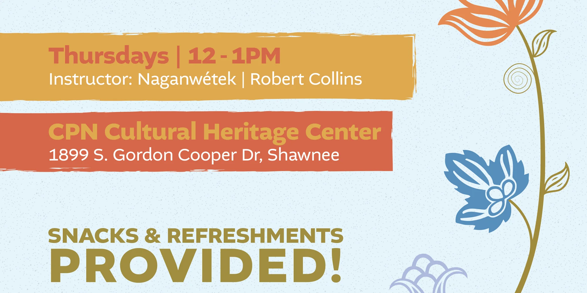 Every other Thursday, 12-1 p.m. at the Cultural Heritage Center. Instructor: Naganwétek | Robert Collins. For questions, contact robert.collins@potawatomi.org or 405-878-5830 ext. 1707. Snacks and refreshments provided!