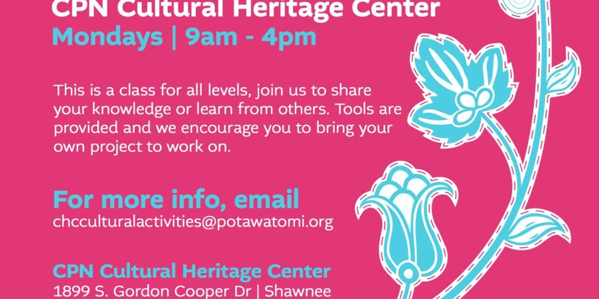 This is a class for all levels, join us to share your knowledge or learn from others. Tools are provided and we encourage you to bring your own project to work on. This month, there will be a two-hour skill session at the beginning of each class as follows: March 2: Colors – Patterns – Options March 9: Materials – Tools – Applying Applique March 16: Finishing Touches – Accents March 23: Practice – Applique Skill March 30: Practice – Applique Skill For more info, email chcculturalactivities@potawatomi.org