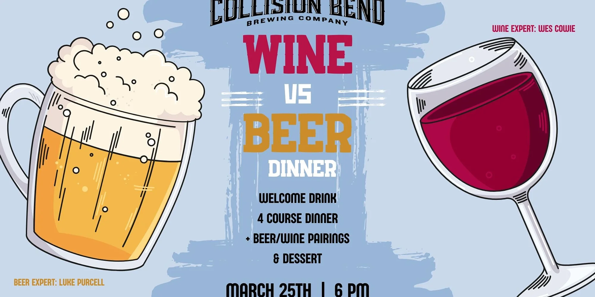 Get ready for a night of incredible flavors, lively conversation and perfectly paired pours! Join us for an unforgettable evening featuring wine expert Wes Cowie of Cutting Edge Wines and brewmaster Luke Purcell of Collision Bend Brewing Company. Together, they’ll guide you through a delicious exploration of how the foods we love can transform, and be transformed by the wines and beers we drink. Enjoy a thoughtfully curated four-course dinner (plus dessert!) while diving into the art and science of pairing. Expect bold flavors, surprising combinations and plenty of fun along the way. Menu includes: First Course : Chili Lime Shrimp Tostada Second Course: Mushroom Frisee with a steamed egg sherry xoxo Third Course: Duck confit , polenta, sweet and sour peppers, paprikash creme fraiche Fourth Course: Cacio di Pepe orzo risotto style Dessert: White chocolate panna cotta Tickets are $65/person (includes tax and gratuity.) Come hungry, come thirsty, and get ready to taste, sip, and discover something new. Cheers! RESERVE YOUR SPOT