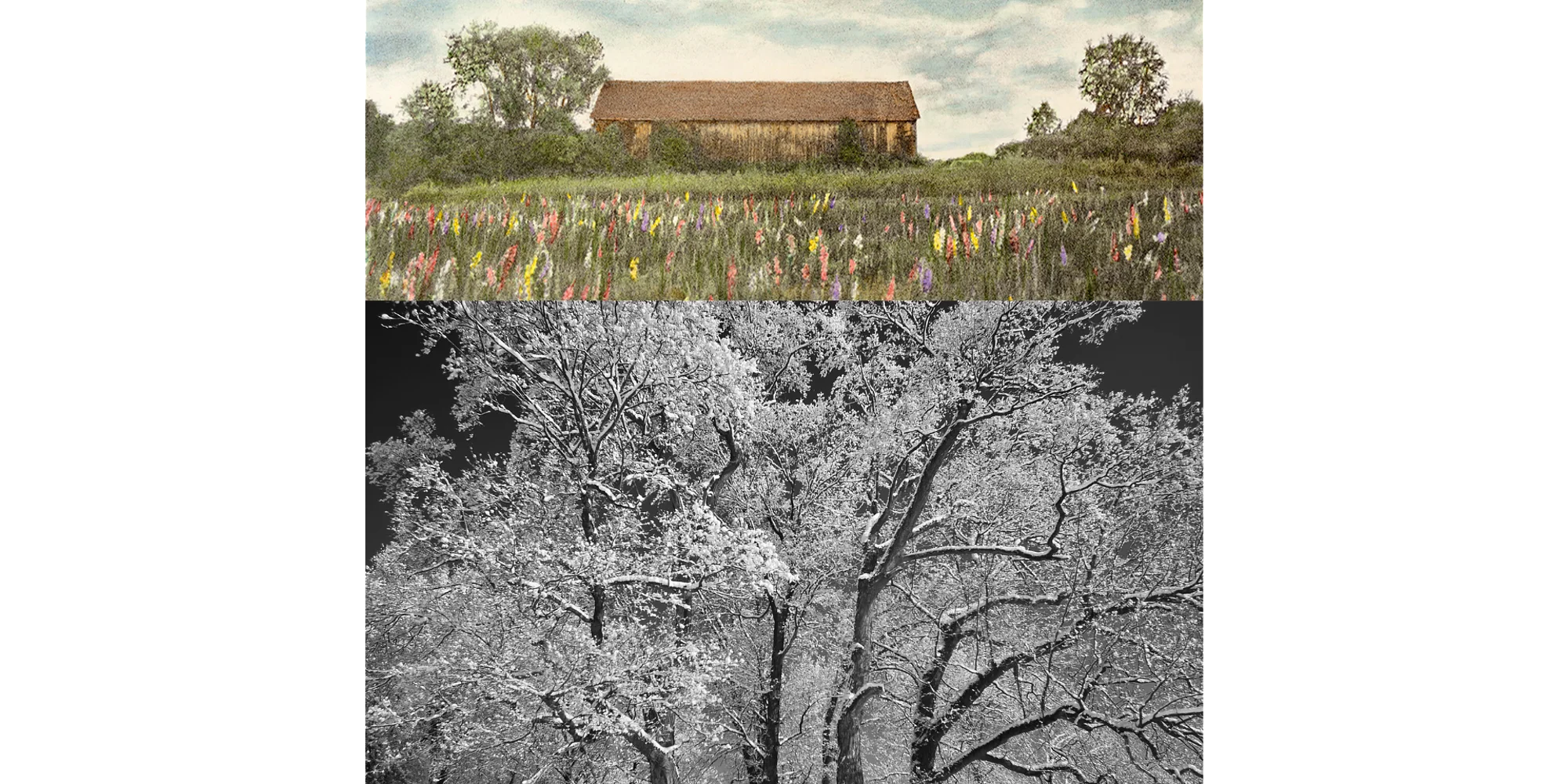 Stop into Phelps-Hatheway’s Visitor Center for the Seasons of Change art exhibition by Laurie Tavino and Ray Pioggia. In this exhibit, photographic and hand-rendered images in color and monochrome depict scenes and themes from locations throughout Suffield – a number of which are views that no longer exist. We invite you to join us for the exhibit’s opening reception on Friday, May 1, from 5 pm–7 pm in the Visitor’s Center. Laurie and Ray will be on site to answer questions as you gather with friends and neighbors to take in the beauty of this special offering. The exhibit will be open during the property’s regular open hours this season through November 1. If you would like to book a tour to accompany your visit, please see the calendar. If you have any questions, please contact phelps.hatheway@ctlandmarks.org. Top image: “Gladiola Farm” by Laurie Tavino Bottom image: “Winter Trees” by Ray Pioggia