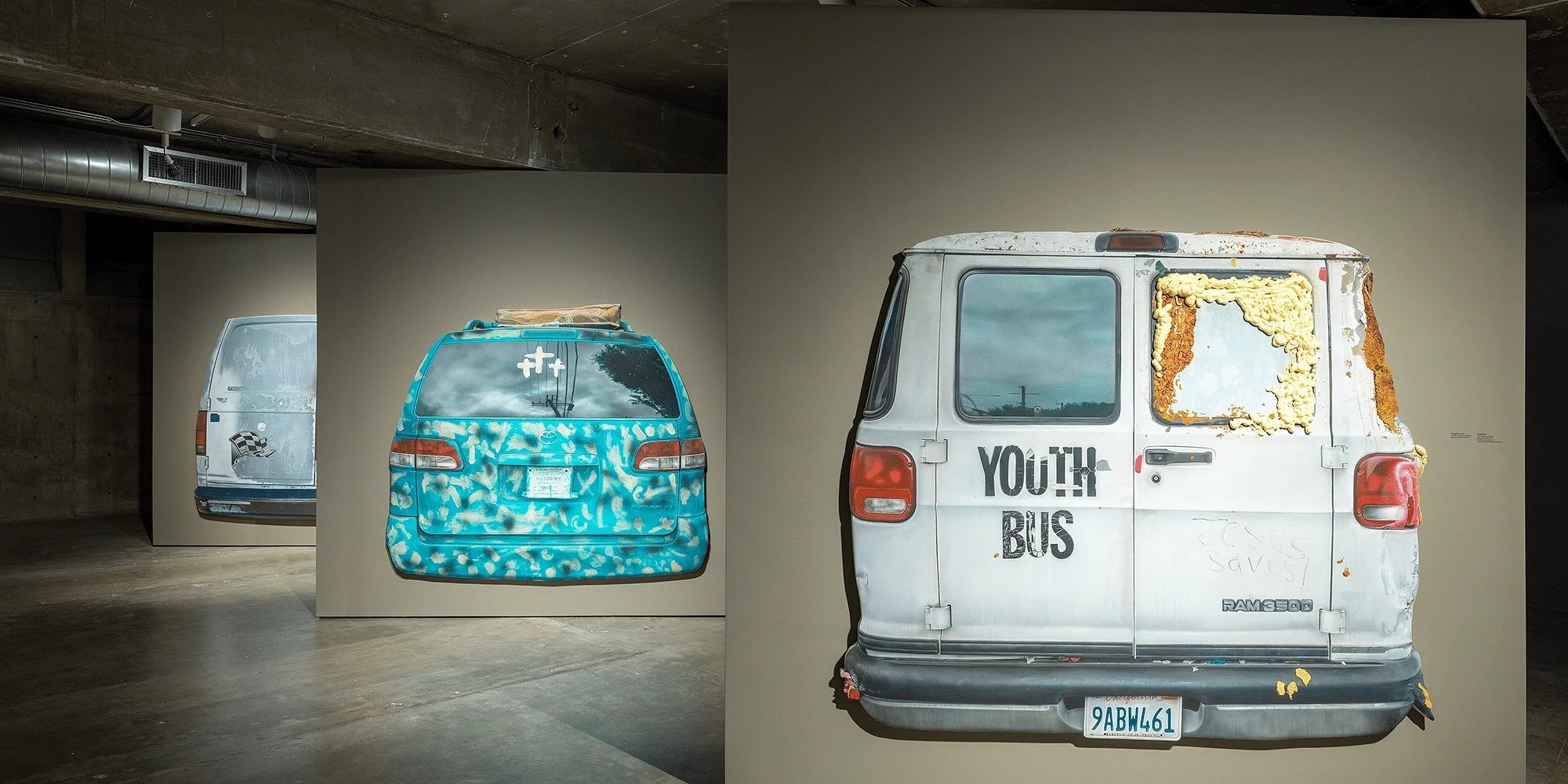 Installation view of Mario Ayala: Seven Vans at Contemporary Arts Museum Houston, 2025. Photo: Alex Barber. Add to calendar Google Calendar iCalendar Outlook 365 Outlook Live About Mario Ayala: Seven Vans is the artist’s first solo museum presentation in the United States. Expanding on his signature shaped canvases-often depicting the back of cars with technical precision-Seven Vans debuts seven life-size van paintings created specifically for Houston. Derived from the word caravan, the van bridges histories of commerce and counterculture. Each painting channels the sensibility and personality of its owner, functioning like a pseudo-portrait. Creating Seven Vans as a collective ensemble, Ayala has rendered members of his city without depicting their faces. Based on the artist’s real-life observations-outside his laundromat, dentist office, and skate park-Ayala invites us to engage parasocially with imagined lives.Known for his expert application of industrial painting techniques such as airbrushing, Ayala produces witty graphic mashups and trompe l’oeil (or optical tricks) on shaped canvases. Ayala draws from visual traditions linked to his home in California, including Mexican-American muralism, body tattooing, and highway signage. Ayala’s connection to the automotive community stems from his father, a truck driver, and his own lifelong interest in car customization and lowrider culture.Seven Vans centers the hybridity that defines Ayala’s work: the interplay of presence and absence, of fine art and popular culture. Through this singular blend, Ayala crafts a personal and imaginative visual vocabulary. Organizers Mario Ayala: Seven Vans is organized by Contemporary Arts Museum Houston (CAMH) and curated by Patricia Restrepo, Curator. The exhibition was was conceived of by Hesse McGraw, CAMH’s former Executive Director. Support Support for Mario Ayala: Seven Vans is provided by David Kordansky Gallery. Contemporary Arts Museum Houston exhibitions are made possible by the patrons, benefactors, and donors to CAMH’s Major Exhibition Fund: Anonymous, Chinhui Juhn and Eddie Allen, Louise Jamail, Sissy and Denny Kempner, and Beverly and Howard Robinson. About the Artist Mario Ayala (b. 1991, Los Angeles) reimagines a contemporary landscape where identity, observation, and the presence of material fact play equal roles. In his paintings, Ayala brings together figures and forms drawn from every corner of his experience living on the West Coast. Ayala’s work lends interest in traditions and techniques with strong visual ties to California, such as muralism, tattooing, and industrial techniques used in automobile painting and commercial signage. Ayala’s influences also extend into postwar art historical movements such as the Cool School of Los Angeles and Bay Area Funk art. Ayala’s highly personal, often surreal, tableaux are vivid representations of the way in which images course through the world, carrying with them fragment...