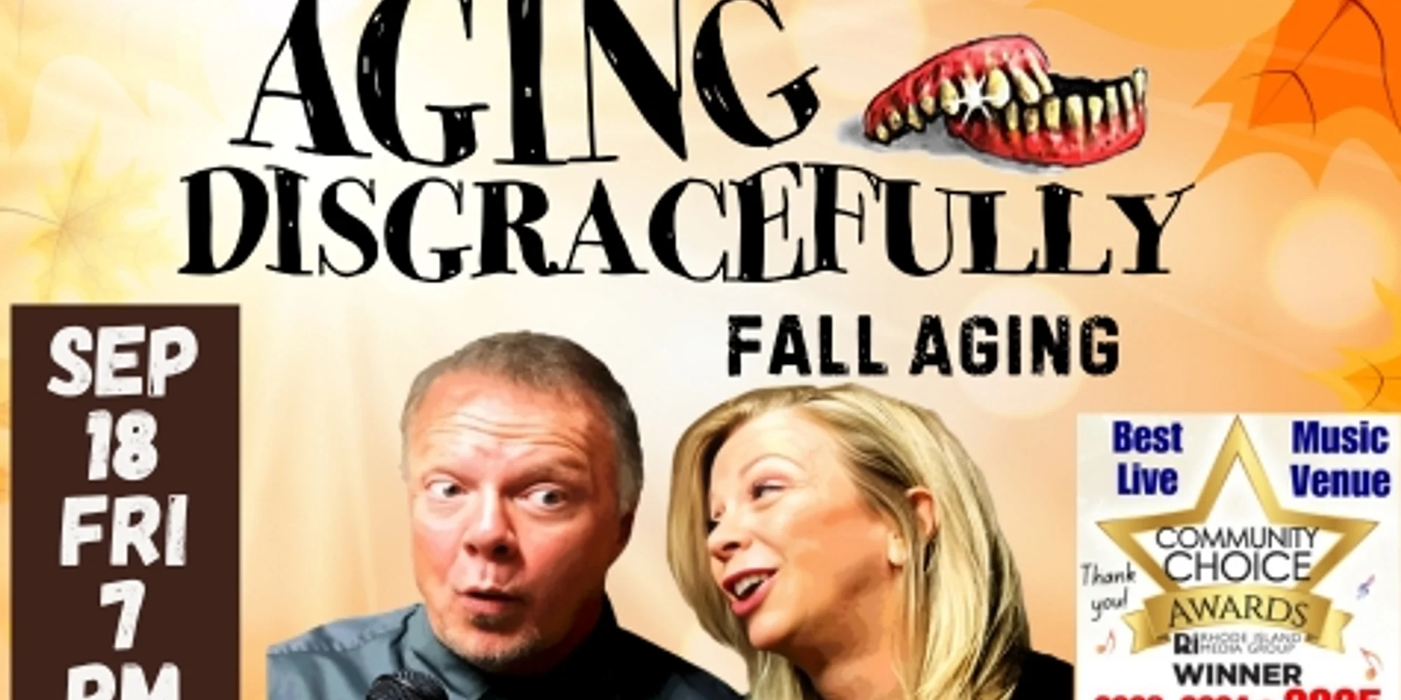 AGING DISGRACEFULLY is a hit comedy show led by RI Comedy Hall of Famers Charlie Hall and Doreen Collins. It’s a mix of stand-up, song, and skits, on the perks of trying to stay young and the pitfalls of getting old. From botox to bifocals to bingo, this dynamic duo covers it all in jokes and musical parodies. These two put a seasonal twist on things you all know about and deal with that will have you in stitches. You’ll relate to all the jokes and never forget them when you leave. See what they have to say about aging during the autumn. Buy Tickets All ages. No outside food & drink. Full bar and plentiful free parking onsite. Come see why the Courthouse has won #1 Live Music Venue across 2023, 2024, and 2025!