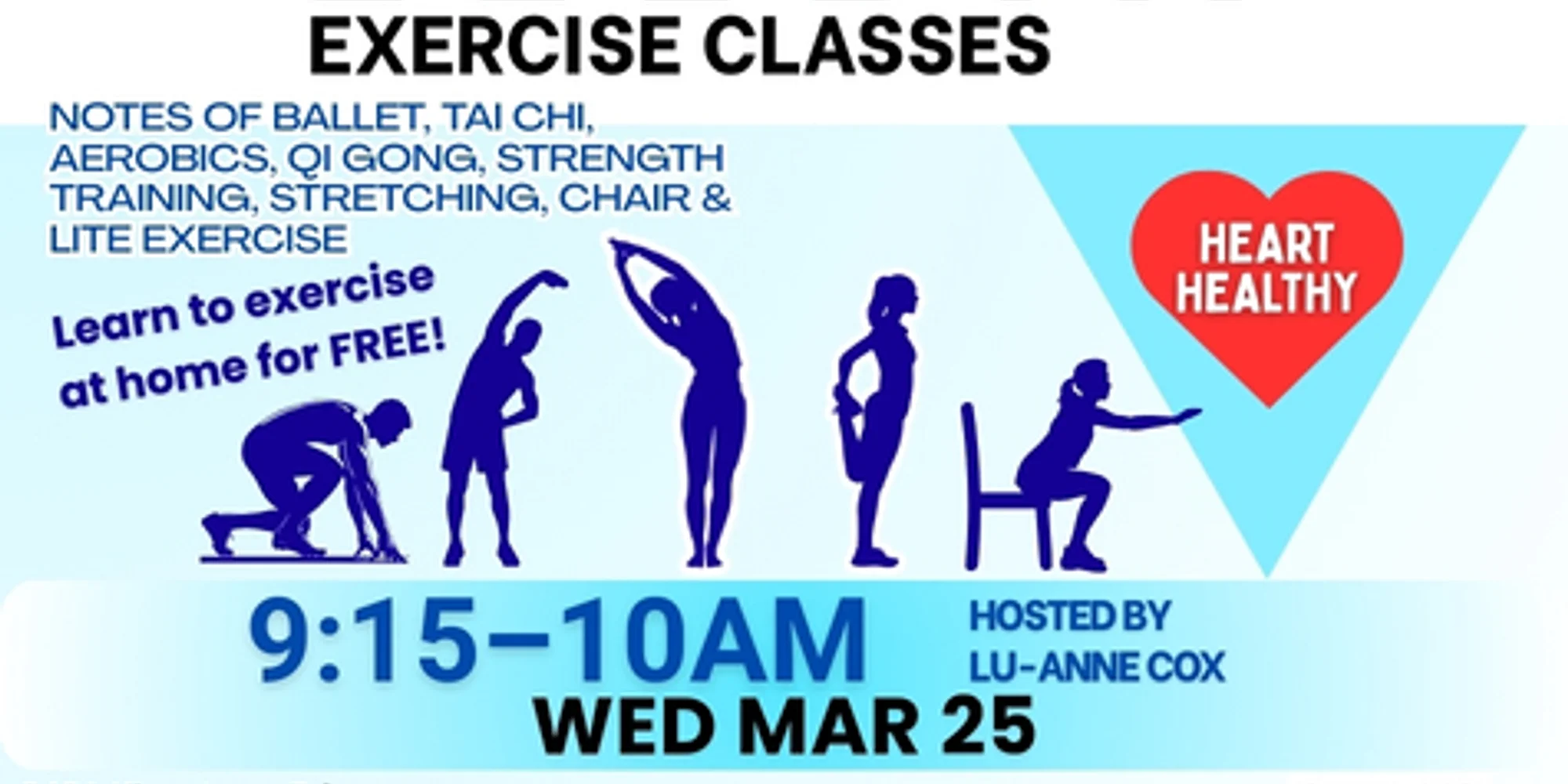 Bring a friend, make new friends, and have fun while getting fit! EZ 2 B FIT is a welcoming exercise class designed for those who are beginning or returning to fitness. Hosted by Lu-Anne Cox, these sessions blend elements of Ballet, Tai Chi, Aerobics, Qi Gong, Strength Training, and Stretching into an easygoing, non-gym-like environment. You’ll use chairs and stretch bands for support, and adaptations are available to fit all fitness levels. You are welcome to bring a water bottle and a yoga mat if you wish. Learn simple moves you can practice at home for free—and take steps toward a more heart-healthy lifestyle! RSVP Free Tickets All Ages. No outside food or drink.