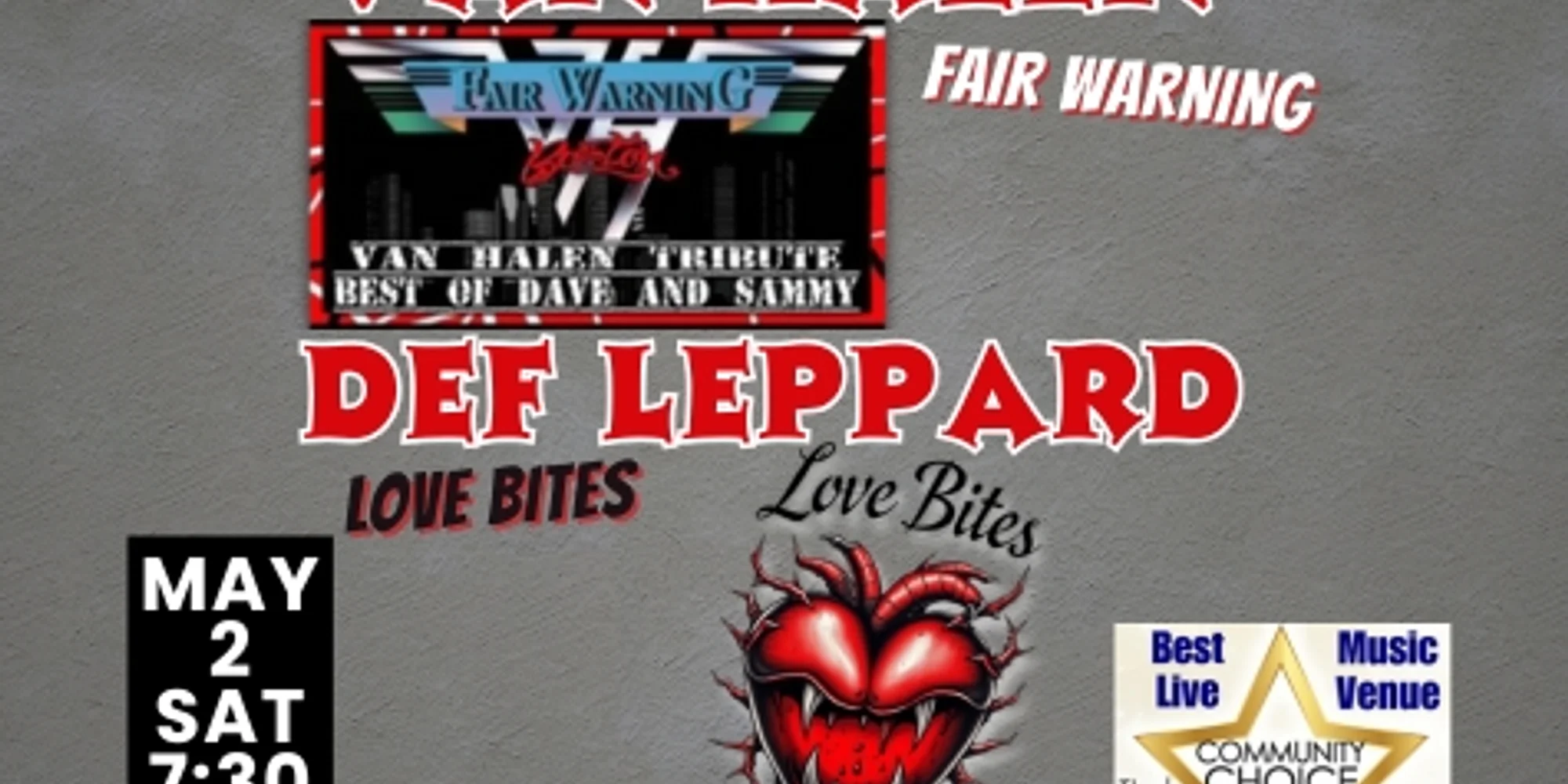 If you’re ready to Jump and Dance the Night Away, this night’s for you! Two legendary tributes share one explosive stage… Love Bites takes a striking Photograph of Def Leppard, while Fair Warning fires off an Eruption of Van Halen. This show is the ultimate ’80s arena showdown, like a Rock of Ages in Panama. Come get your tickets before they sell out! Buy Tickets All ages. No outside food & drink. Full bar and plentiful free parking onsite. Come see why the Courthouse has won #1 Live Music Venue three years running across 2023, 2024, and 2025!