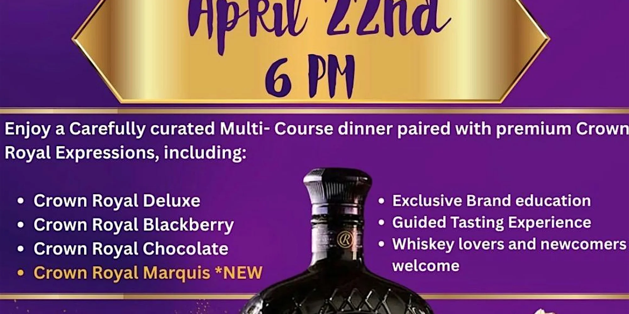 “An Exclusive Whiskey & Culinary Experience ” This event is limited to only 50 attendees. Enjoy a carefully curated multi-course dinner paired with premium Crown Royal Expressions including: Crown Royal Deluxe Crown Royal Blackberry Crown Royal Chocolate Crown Royal Margarita (New) Exclusive Brand Education Guided Tasting Experience Whiskey Lovers and Newcomers Welcome