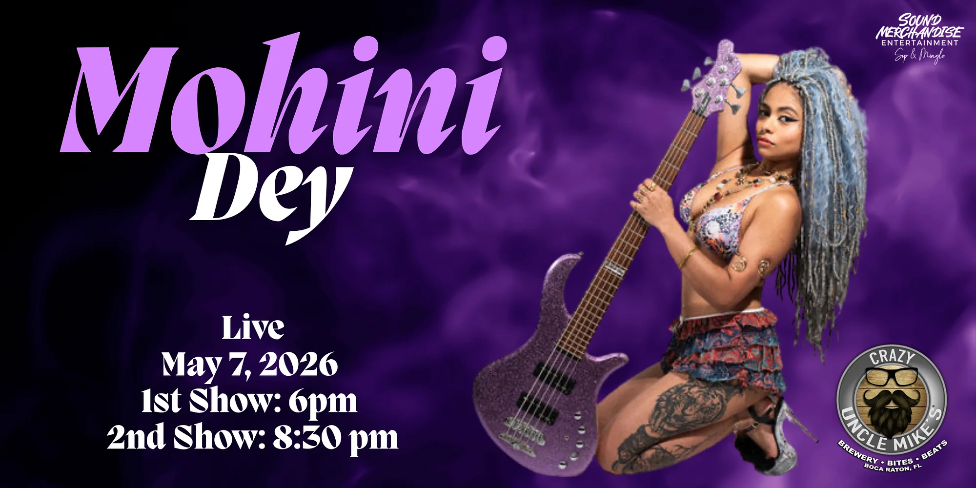 We are proud to present internationally acclaimed bass virtuoso Mohini Dey for a special performance at Crazy Uncle Mike’s in Boca Raton this May. Recognized worldwide for her extraordinary technique, musical versatility, and electrifying stage presence, Mohini Dey has established herself as one of the most exciting bass players of her generation. Having toured globally and collaborated with renowned artists across multiple genres, her music blends jazz fusion, funk, rock, and world influences into a powerful, genre-defying sound. Audiences can expect an evening of high-energy musicianship, deep grooves, intricate solos, and dynamic interplay that showcases both technical brilliance and expressive artistry. Whether you’re a musician, a jazz enthusiast, or simply a lover of world-class live performance, this show promises an unforgettable musical experience. Join us for a night of rhythm, innovation, and pure musical fire as Mohini Dey takes the stage! GET YOUR TICKETS NOW! May 7th: Mohini Day Can’t make it, don’t worry all of Crazy Uncle Mike’s shows are streamed straight to your living room on our Youtube & Facebook! https://www.eventbrite.com/cc/mohini-day-4816336