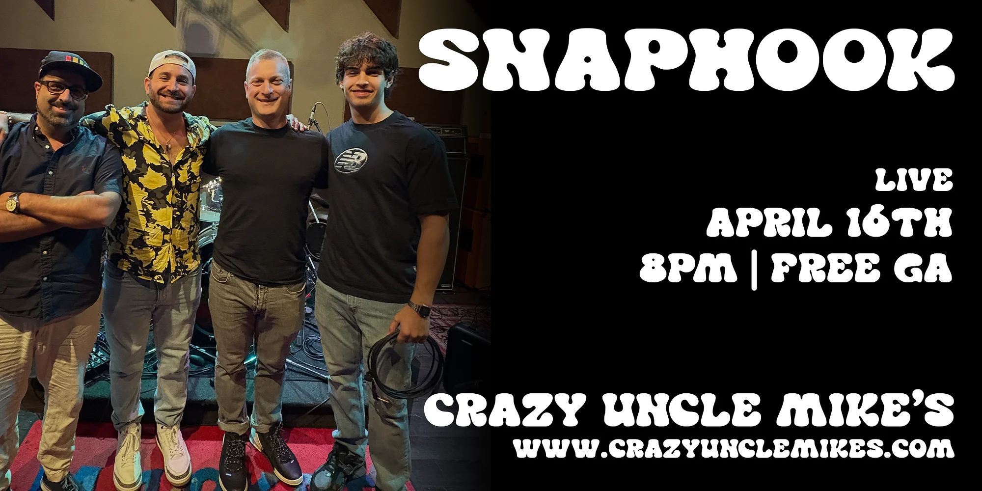 SnapHook is a local 4 piece band playing high-energy “Dad Rock” hits from the 90s–2000s, with some classic rock favorites mixed in. We focus on songs people actually know, and want to sing and dance to, making us a great fit for bars and restaurants looking to draw a younger crowd than the traditional classic-rock audience, while still delivering that familiar nostalgia everyone loves. Our setlist includes artists like Red Hot Chili Peppers, Pearl Jam, Sublime, Foo Fighters, 3 Doors Down, Tom Petty, and Jimi Hendrix. GET YOUR TICKETS NOW! April 16th: Snaphook Can’t make it, don’t worry all of Crazy Uncle Mike’s shows are streamed straight to your living room on our Youtube & Facebook! https://www.eventbrite.com/e/snaphook-tickets-1986352308225?aff=oddtdtcreator