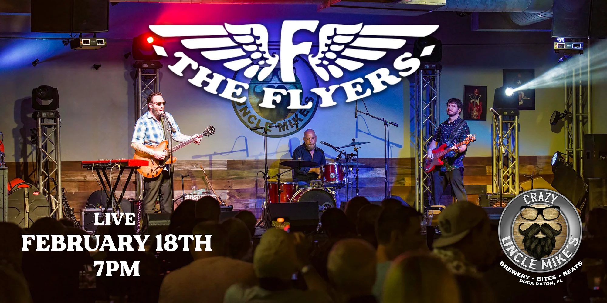 The Flyers are rock band based in Delray Beach, FL. While writing and recording their own music, The Flyers play shows all over South Florida that includes originals and covers of classic hits. This is a tight knit unit consisting of three multi-instrumentalists. You never know who is playing what in this band. Influences include The Beatles, The Band, SRV, Eric Clapton, Jimi Hendrix, Led Zeppelin… GET YOUR TICKETS NOW! February 18th: The Flyers Can’t make it, don’t worry all of Crazy Uncle Mike’s shows are streamed straight to your living room on our Youtube & Facebook! https://www.eventbrite.com/e/the-flyers-tickets-1981618088045?aff=oddtdtcreator