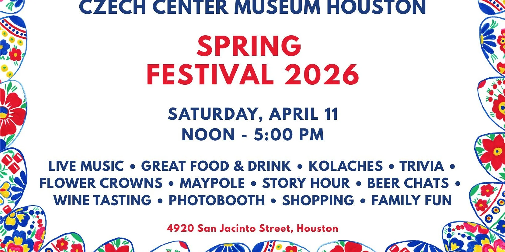 Hosted by the Czech Center Museum Houston, we’re dedicated to preserving and promoting Czech and Slovak culture, heritage, and traditions in the Greater Houston area. Join us for a special day filled with traditional music, folk dances, delicious food, and an incredible community atmosphere as we mark this annual event! Whether you’re reconnecting with your roots or discovering these vibrant traditions for the first time, we want you to be a part of it. Let’s make this year’s celebration unforgettable and keep our cultural customs alive for future generations. tickets / entrance Admission at the door $10 (adults) Children age 12 and under admitted free Free admission after 4 PM Online ticket sales end at 5 PM on Friday, April 10. eating and DRINKING MENU Sausage-on-a-Stick Sausage on a stick served with bread and a pickle with a side of mustard or horseradish. Bramborák (Potato Pan-cake) Shredded potato baked on a sheet Potato Salad Sauerkraut Salad Palačinka (Crepe) Thin crepe filled with marmalade (whipped cream optional) beverages Soft Drink Sparkling Water Iced Tea Lemonade Water Texas Coffee Beer (Pivo) Wine (Víno) COUNTRY STORE Garlic Dill Pickles Kolaches Apple Strudel Poppyseed Roll Mazanec (Easter Bread) Poppyseed Cake Cookies live czech music volunteer festival sign up CHS Texas Royal Court members 2025 Community Partners
