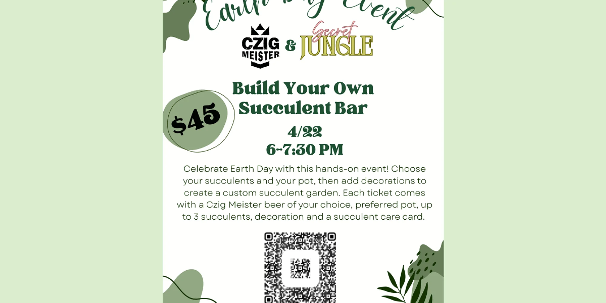 Join The Secret Jungle on April 22nd to celebrate Earth Day with this hands-on, creative experience! 🌿✨ Choose your succulents and pot, then decorate your very own custom succulent garden. Each ticket includes a Czig Meister beer of your choice 🍻, your preferred pot, up to 3 succulents, fun decorations, and a succulent care card to keep your plants thriving. Grab your spot and get ready for a relaxing, plant-filled night! 🌎💚