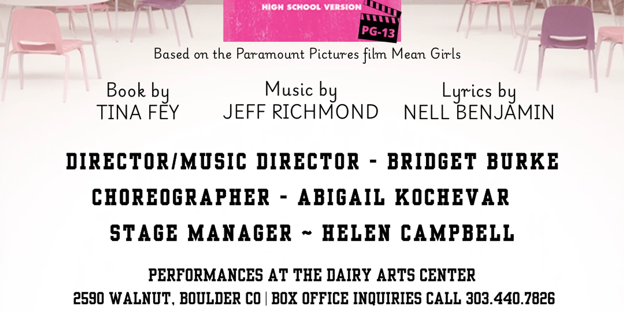 TICKETS CenterStage is delighted to be returning to the Dairy Arts Center for our 2026 Winter/Spring mainstage production which will be presented in the 117-seat Grace Gamm theatre at the Dairy Arts Center in Boulder. NOTE THAT MEAN GIRLS; HIGH SCHOOL VERSION IS PG-13 – Parents Strongly Cautioned. Some material may be inappropriate for children under 13. Parents are urged to be cautious. Some material may be inappropriate for pre-teenagers. Each person entering, regardless of age, must be ticketed. It is up to the parent/guardian to determine if event age appropriate. If a patron becomes disruptive, that patron, and the group they arrived with, may be asked to leave. No refunds. No children in laps, seat sharing, or infants in carriers or arms will be permitted. Cady Heron may have grown up on an African savanna, but nothing prepared her for the wild and vicious ways of her strange new home: suburban Illinois. How will this naïve newbie rise to the top of the popularity pecking order? By taking on The Plastics, a trio of lionized frenemies led by the charming but ruthless Regina George. But when Cady and her friends devise a “Revenge Party” to end Regina’s reign, she learns the hard way that you can’t cross a queen bee without getting stung. MEAN GIRLS; Book by TINA FEY; Music by JEFF RICHMOND; Lyrics by NELL BENJAMIN. Based on the Paramount Pictures film Mean Girls. Original Broadway Production Produced by Lorne Michaels, Stuart Thompson, Sonia Friedman. Paramount PictureS Marisa Sechrest, Ars Nova Entertainment, Berlind Productions, Steve Burke, Scott M. Dellman, Roy Furman, Robert Greenblatt, Ruth Hendel, Jam Theatricals, The John Gore Foundation, The Lowy Salpeter Company, James L. Nederalnder, Christine Schwarzman, Universal Theatrical Group. Executive Producer; David Turner. Mean Girls Is presented through special arrangement with Music Theatre International (MTI). All authorized performance materials are also supplied by MTI. www.mtishows.com. ANY VIDEO AND/OR AUDIO RECORDING OF THIS PRODUCTION IS STRICTLY PROHIBITED.