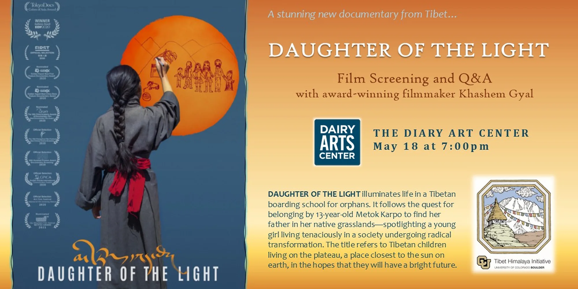 TICKETS Sponsored by the Tibet Himalaya Initiative at CU Boulder Film Screening followed by Q&A with the filmmaker Khashem Gyal This film illuminates life in a Tibetan boarding school for orphans. It follows the quest for belonging by 13-year-old Metok Karpo to find her father in her native grasslands- spotlighting a young girl living tenaciously in a society undergoing radical transformation. The title refers to Tebatan children living on the plateau, a place closest to the sun on earth, in the hopes that they will have a bright future. Khashem Gyal is an award-winning filmmaker from the Amdo region of Tibet. In 2018, he was nominated for the Adeste Gold Medal, recognizing global citizens under 40 who help us ‘dream bigger.’ He is currently an Asia in Action Artist at the Weatherhead East Asian Institute at Columbia University.