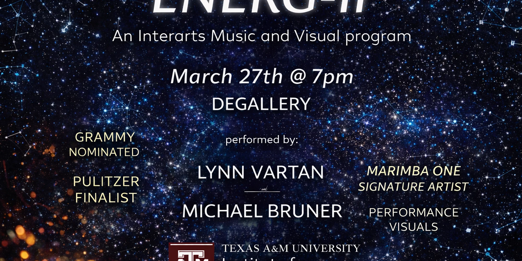 ENERG-ii An Interarts Music & Visual Program Join us at DEGALLERY for ENERG-ii, a powerful interdisciplinary performance exploring the many manifestations of energy—physical, creative, and historical—expressed through sound and image. The program features Lynn Vartan, percussionist, Grammy-nominated artist, Pulitzer Prize finalist, and Marimba One Signature Artist, alongside Michael Bruner, whose real-time digital visualizations transform sound into immersive visual landscapes. Together, they create a multi-sensory performance in which vibration, resonance, and motion become visible and audible. Centered around the vibraphone, the music evokes static electricity, kinetic force, flowing water, and reflections on the atomic age, while Bruner’s responsive visuals shimmer, pulse, and evolve live with the performance—expanding the experience beyond sound alone. March 27 | 7:00 PM DEGALLERY Presented in collaboration with the Institute for Applied Creativity, Texas A&M University Experience an evening where contemporary music, visual art, and technology converge into a meditation on energy—intangible yet undeniable, dangerous yet beautiful, endlessly transformative. Admission is FREE. Please RSVP. Join us for an unforgettable night of contemporary performance, innovation, and artistic exploration.