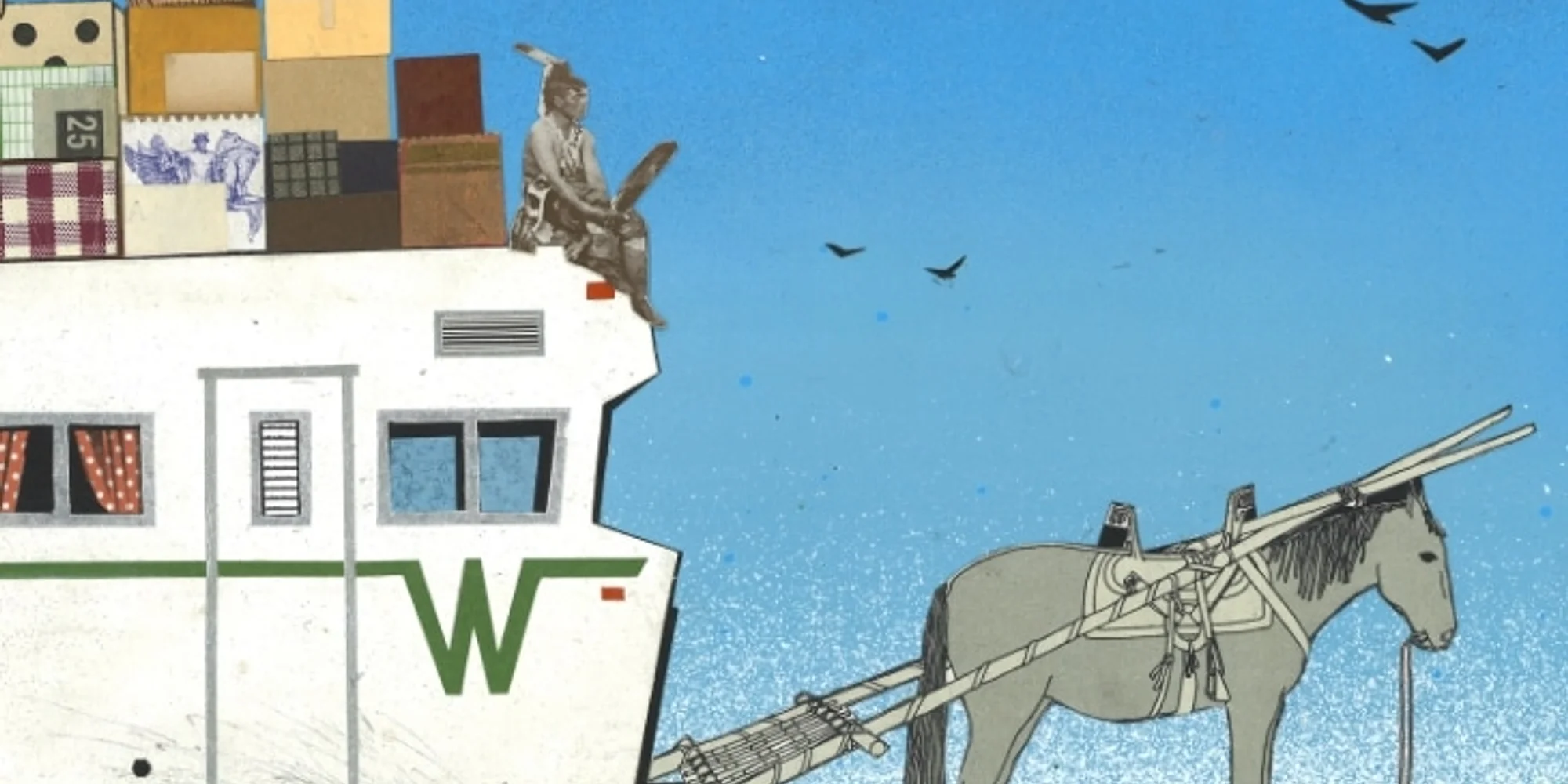 Join us for a guided tour of “Iowa Artists 2026: Henry Payer: Aagakinąk Haciwi: We Live Opposite Each Other” in the A.H. Blank Gallery and Krause Atrium. For the 2026 edition of Iowa Artists, the annual exhibition series celebrating artists from our home state, which has been ongoing since 1950, the Art Center welcomes Sioux City-born artist Henry Payer (born 1986). A member of the Ho Chunk people, whose ancestral territory spans areas in Wisconsin, Minnesota, Illinois, and Iowa, Payer explores his history and identity as an Indigenous American. “Aagakinąk Haciwi: We Live Opposite Each Other” will feature Payer’s signature mixed media works with imagery from both Native traditions and Western popular culture. Public guided tours are offered every Saturday from 1 – 2 pm. Free; no registration required. Henry Payer (Ho Chunk, born 1986) “Wandering Winnebago No. 5” (detail) Mixed media Courtesy of the artist