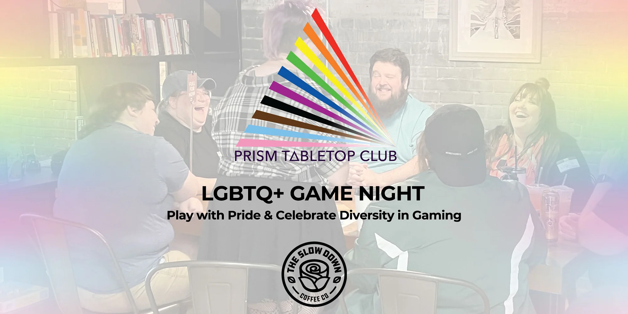 Join The Rook Room for Prism Tabletop Club, a monthly LGBTQ+ board gaming meetup group celebrating the diversity in the gaming community. We’ll be hanging out at The Slow Down Coffee Co. from 6:00 PM to 8:00 PM every first Wednesday of the month. The Rook Room will be bringing our collection of hundreds of games to play, and The Slow Down will be serving up delicious beverages all night! So bring some friends or come ready to make some new ones. All ages are welcome and encouraged to attend. There is no cost to come and play! Prism Tabletop Club is held at The Slow Down on the first Wednesday of each month (except during holidays and other extenuating circumstances – please double-check dates and times). About Prism Tabletop Club The goal of Prism Tabletop Club is to create a safe and welcoming space for LGBTQIA-identifying individuals of all ages to build a lasting, supportive community connecting over a shared love of games on a regular, twice-monthly basis. We encourage you to gather, play games, slay dragons, piece together puzzles, hang out, and meet new friends! As a completely LGBTQ-owned business, The Rook Room is excited to help arrange and sponsor Prism Tabletop Club as an accessible and welcoming event. * * * * * By attending this event, you are agreeing to our Purchase & Attendance Agreement. The full agreement can be found at therookroom.com/purchase-attendance-agreement/ View our full Privacy Policy at therookroom.com/privacy-policy