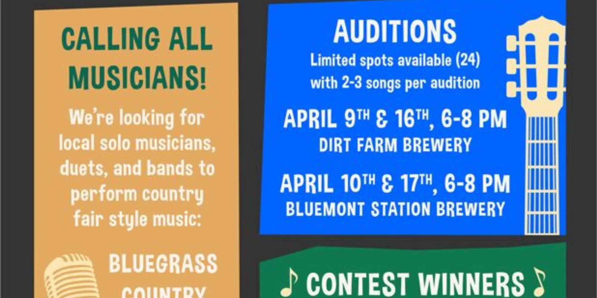 Calling all musicians for the 2026 Bluemont Fair Music Contest! Think you’ve got what it takes to rock the Beer Garden Stage at the 2026 Bluemont Fair? Now’s your chance! We’re looking for local solo artists, duets, and bands performing country fair style music – bluegrass, country, folk, blues, and rock. Auditions: Limited to just 24 spots – each audition includes 2–3 songs – April 9 & 16 (6–8 PM) – Dirt Farm Brewing -April 10 & 17 (6–8 PM) – Bluemont Station Brewery & Winery Contest Winners Receive: -A paid performance slot at the Bluemont Fair Beer Garden Stage (Saturday or Sunday) – $300–$1,000 paid slots available for winners Apply online by April 2, 2026 at https://www.bluemontfair.org/band-application/ Questions? Contact beergardenbands@bluemontfair.org. Spots are limited! Bring your best set and let’s make the 2026 Bluemont Fair unforgettable! Whether you’re coming out from Washington D.C., Alexandria, Arlington, or Baltimore, or you’re just cruising over from Round Hill, Purcellville, Clarke County, or Winchester, we’re always glad to welcome friendly faces here in Bluemont—near or far. Our community stretches across the region, and nothing makes us happier than sharing good beer, great food, and even better company with all of you right here in Loudoun County, Virginia!