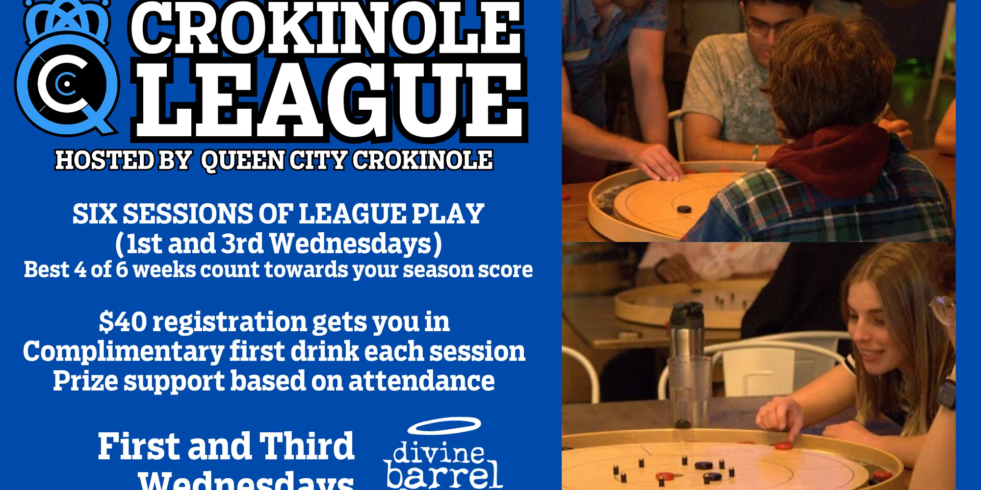 Every first and third Wednesday is Crokinole Night with Queen City Crokinole! Come learn the best flickin’ game in town for free, and join in our rolling Crokinole League to compete for big prizes!