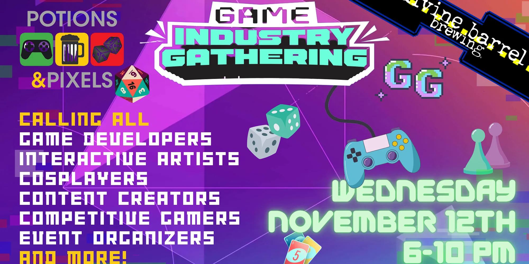 Potions & Pixels Game Industry Gathering | We are back with another Potions & Pixels Game Industry Gathering at Divine Barrel Brewing on Wednesday, November 12th from 6-10pm! Join us for a special game industry networking event full of games, drinks and amazing people! Whether you are part of the game industry or aspiring to be, POTIONS & PIXELS is inviting YOU to help grow the game industry in Charlotte! This event is for: Game Developers (EVERYONE involved with ANY aspect of game development) Interactive Artists (Immersive Art) Cosplayers Content Creators / Streamers / Journalists / Academia Competitive Gamers (eSports & Speedrunners) Game Event Organizers Game Arts & Crafts Creators Game Peripheral Creators Game Business Owners & Employees Details: TIME: 6 – 10 PM LOCATION: Divine Barrel Brewing 3701 N. Davidson St. – Suite #203 Charlotte, NC 28205 COST: FREE