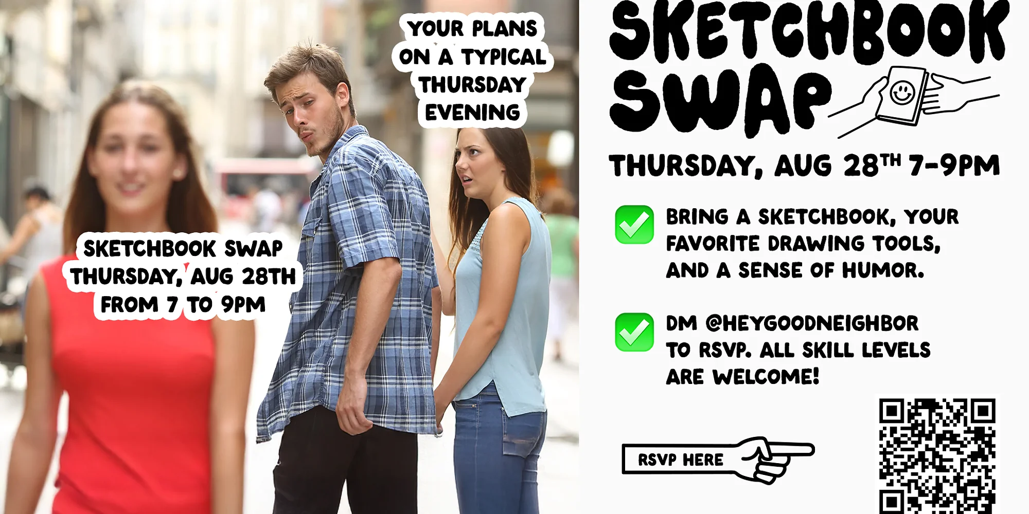 I was explaining how Sketchbook Swap works to a stranger, and they asked, “So it’s kind of like playing musical chairs with your sketchbook, right?” Bingo. Round 9 of Sketchbook Swap is happening at @divinebarrelclt this Thursday, Nov. 20th from 7-9pm. DM @HeyGoodNeighbor and I’ll save you a seat. What is Sketchbook Swap? Bring your favorite sketchbook and drawing medium. We use randomly chosen 7 minute drawing prompts. After the time goes off, everyone passes the sketchbook they were working in to the left and we repeat until we get our sketchbooks back.