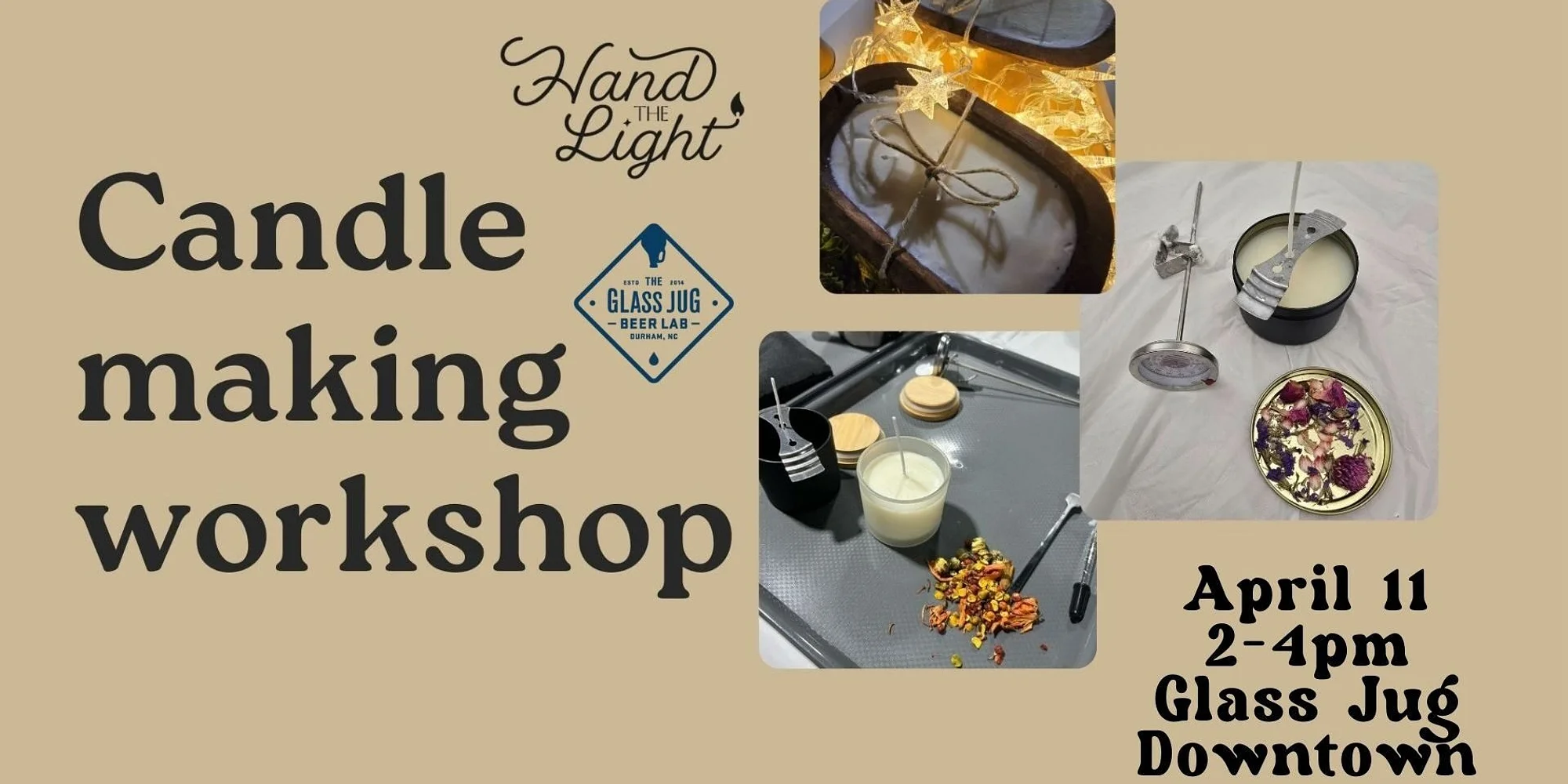 Unwind, sip, and spark your creativity at our Sip & Create Candle-Making Workshop! Whether you’re planning a date night, gathering with friends, or just looking for a fun solo experience, this relaxed and social workshop from Hand the Light is the perfect way to spend your evening. What You’ll Create: Each ticket includes the opportunity to craft two custom 8oz soy candles in classic tins. You’ll blend your own signature scent from a curated fragrance bar, pour your candles, and personalize them with decorative elements. Tickets: • $39 – Two 8oz candles (plus Eventbrite fees) • Optional vessel upgrades available at checkout What’s Included • All candle-making materials (soy wax, fragrance oils, wicks, vessels, decor, etc.) • Step-by-step instruction • A fun, social atmosphere • Two handcrafted candles to take home Please Note • Family-friendly! Children are welcome with an accompanying adult. • Workshop runs approximately 2 hours • Refunds available up to 7 days before the event • Maximum 10-minute late arrival window • Each attendee must purchase their own ticket – no ticket sharing Grab a drink, gather your friends, and join us for a laid-back night of creativity at The Glass Jug. Spots are limited – reserve yours today here and Sip & Create!