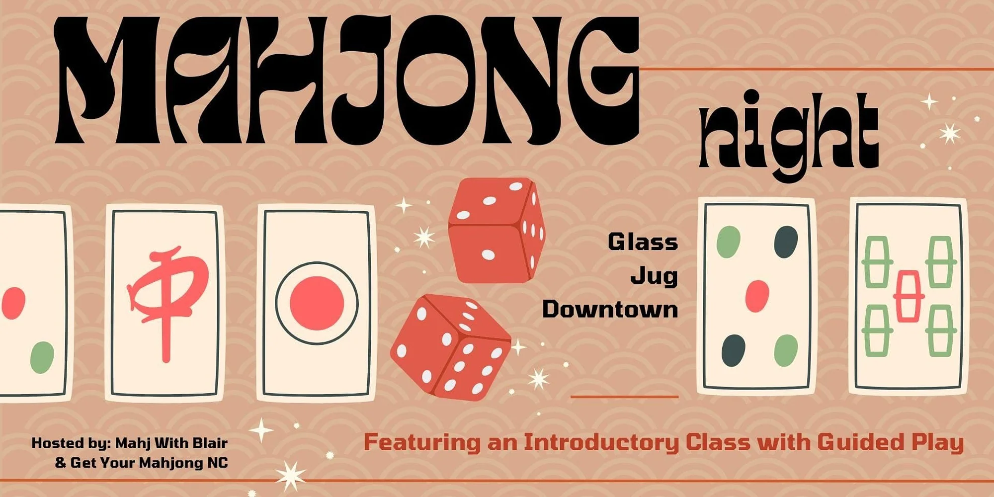 Want to try a fun, strategic game that’s been played for centuries? Join us at Glass Jug Downtown for an evening of Mahjong! Mahjong is a mesmerizing game of skill, strategy, and calculation involving domino-like tiles. It’s easy to learn but offers endless depth, making it incredibly addictive. Mahj with Blair and Get Your Mahjong NC will teach a hands-on class to learn the basics of American Mahjong, to build confidence, and start playing right away. No experience needed – we’ll bring everything. Already played, but still need assistance with the game? We’ll also have guided play. Come from 6:30 – 8:30pm to learn to build sequences, pairs, pungs, and kongs while enjoying our rotating selection of craft beer and unique cocktails. Join us to learn a new skill, challenge your brain, and maybe even find your lucky tile! Introduction Class for beginners: $40/pp Guided Play: $20/pp Open Play: $10/pp Simply email getyourmahjongnc@gmail.com to reserve your space on any date and pay.
